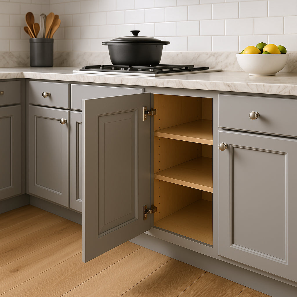 The Grayson Pearl Gray Base Cabinet combines timeless design with durable construction. Featuring a soft close mechanism and adjustable shelves, it offers both elegance and practicality for your kitchen.