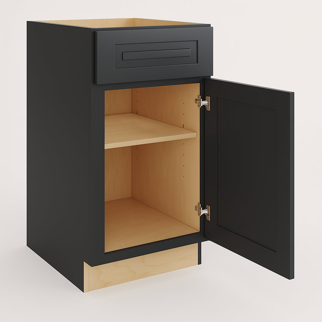 The Grayson Base Kitchen Cabinet in Deep Onyx combines elegant design with durable plywood construction. Featuring soft-close doors and drawers, it offers both style and functionality for a sophisticated kitchen space.