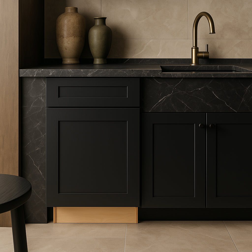The Grayson Kitchen Cabinet in Deep Onyx combines robust plywood construction with a sleek, modern finish. Featuring soft-close doors and drawers, it offers both durability and elegance for a sophisticated kitchen.