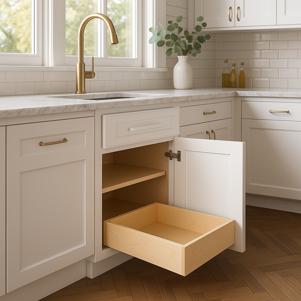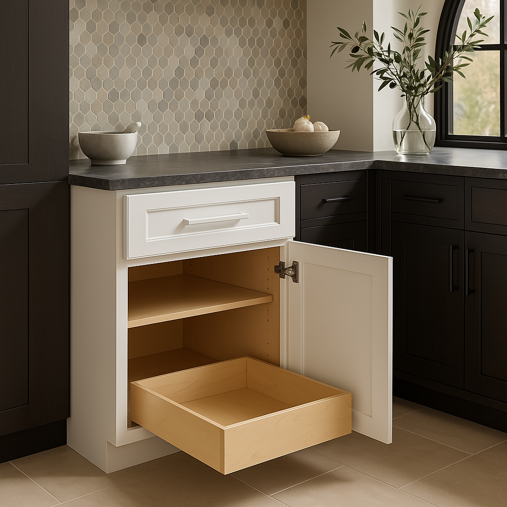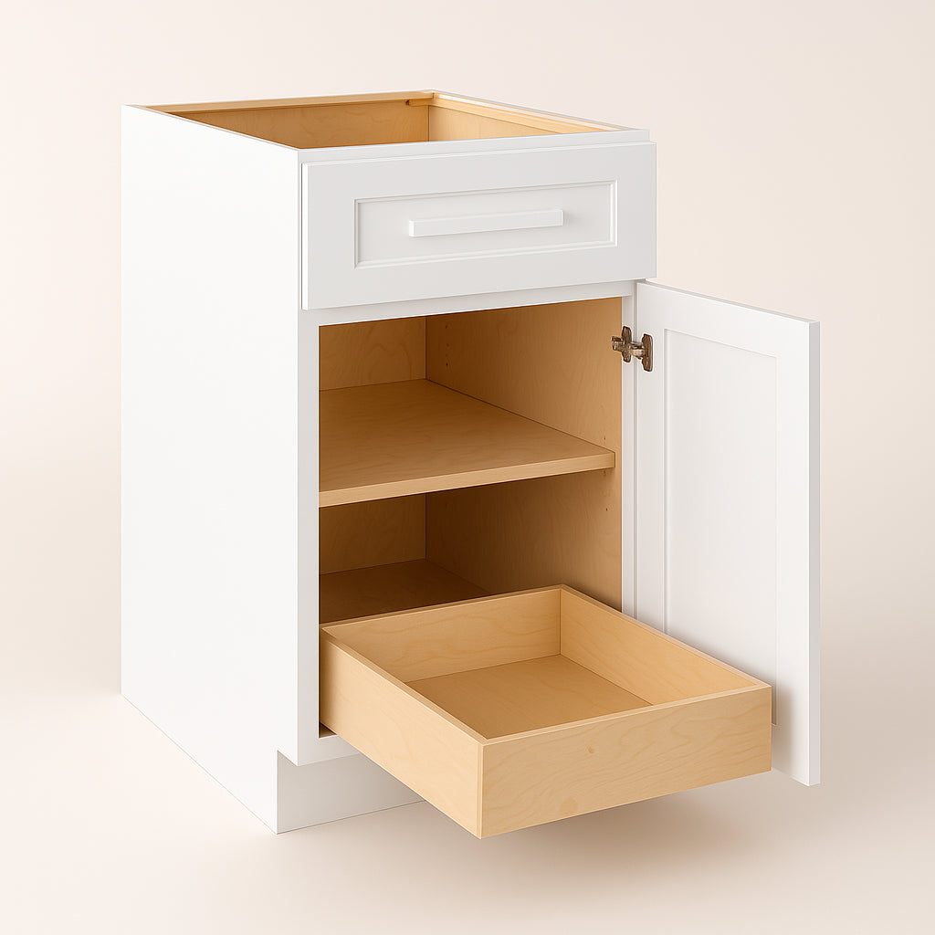 The Grayson Kitchen Base Cabinet in Pacific White combines premium plywood construction with a transitional Shaker-style design. Featuring soft close doors and drawers, it offers both durability and quiet luxury, making it a perfect addition to any modern kitchen.