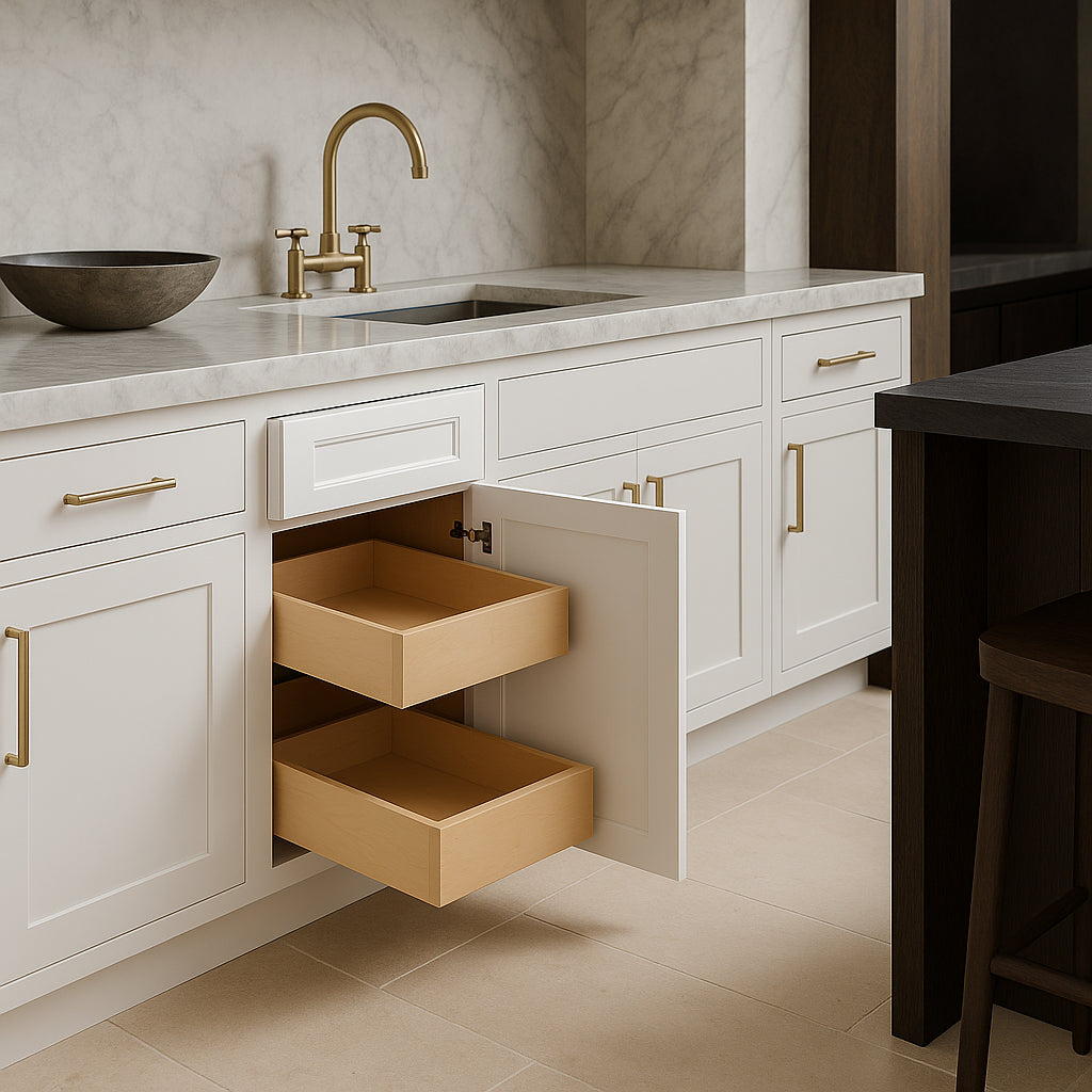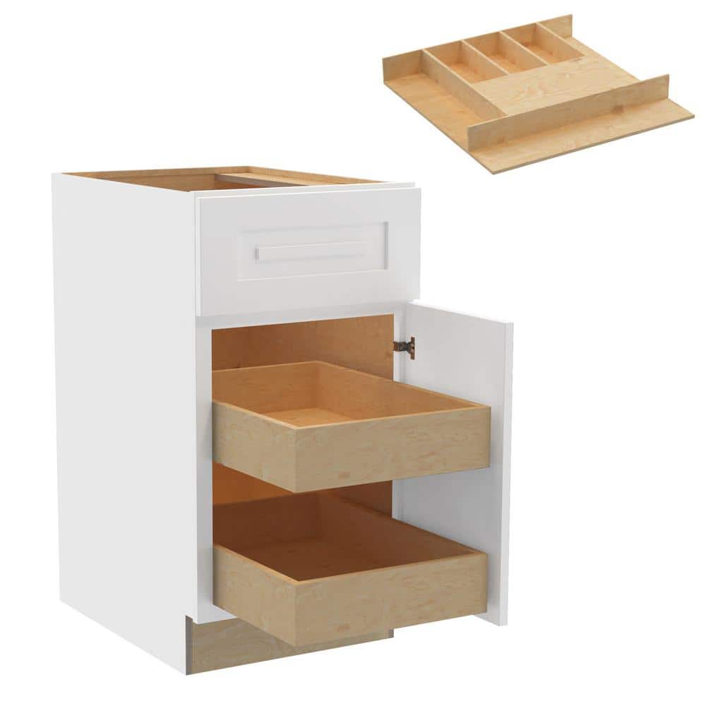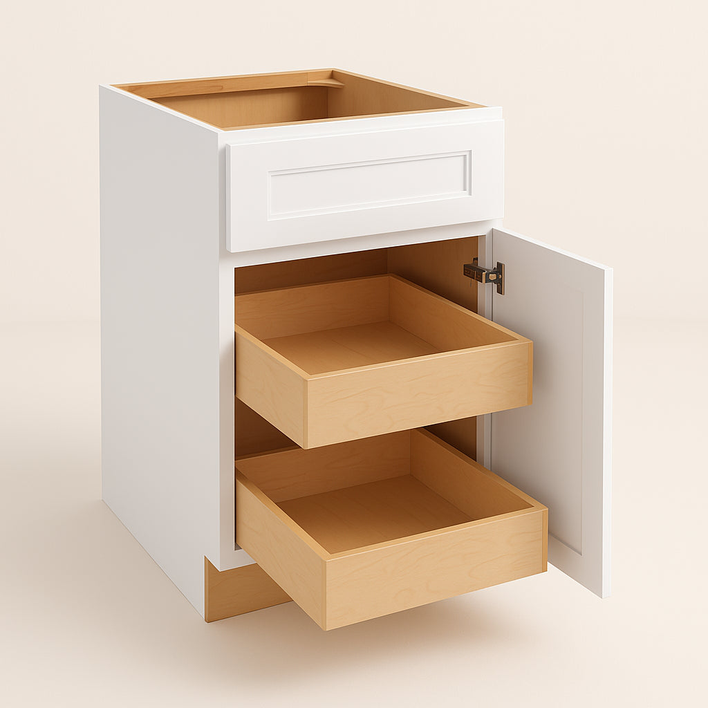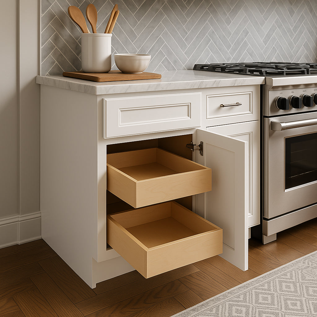 - Ample Storage: Equipped with 90 lb. capacity soft-close rollout trays and a cutlery tray insert.