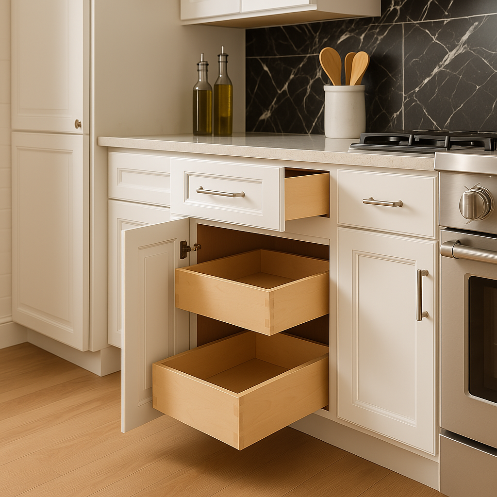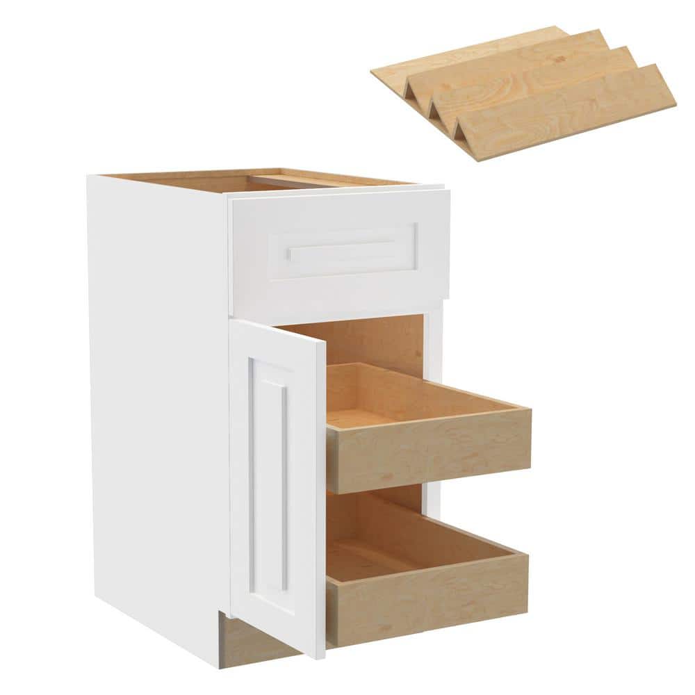 The Grayson Kitchen Cabinet by Home Decorators Collection combines elegant design with practical features. Crafted from CARB compliant all-plywood, it offers adjustable shelves, soft close doors, and integrated spice trays, making it a durable and stylish addition to any kitchen.