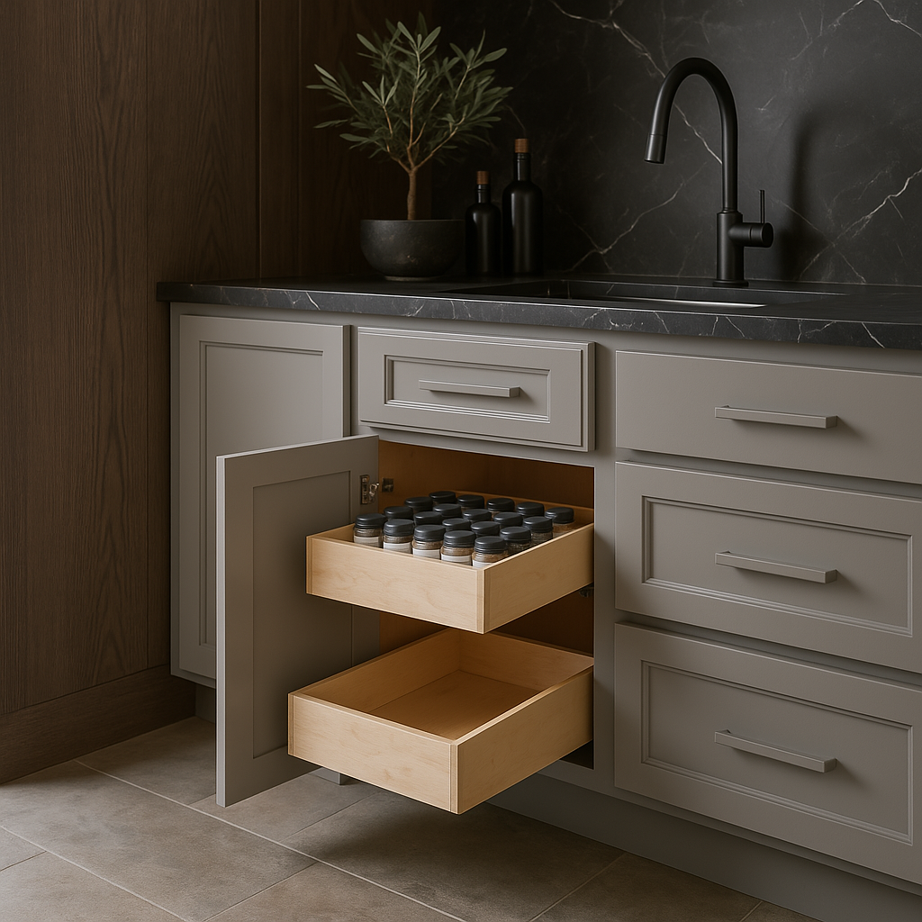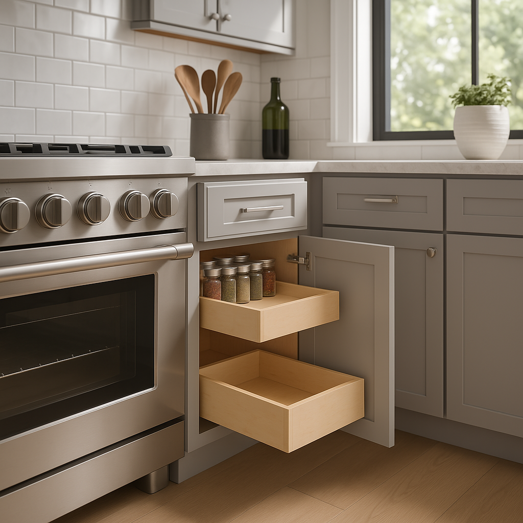 • Ample Storage: Equipped with rollout trays and spice tray insert for organized storage.