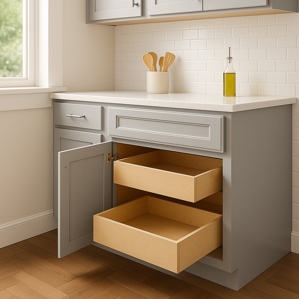 The Grayson Kitchen Base Cabinet is a masterpiece of design and functionality, seamlessly blending into any modern or transitional kitchen. Its pearl gray finish exudes sophistication, while the soft-close features add a touch of luxury to everyday use. Pair it with contrasting countertops or chrome fixtures to create a striking yet harmonious aesthetic. This cabinet is not just a storage solution but a statement piece that transforms your kitchen into a haven of style and practicality.
