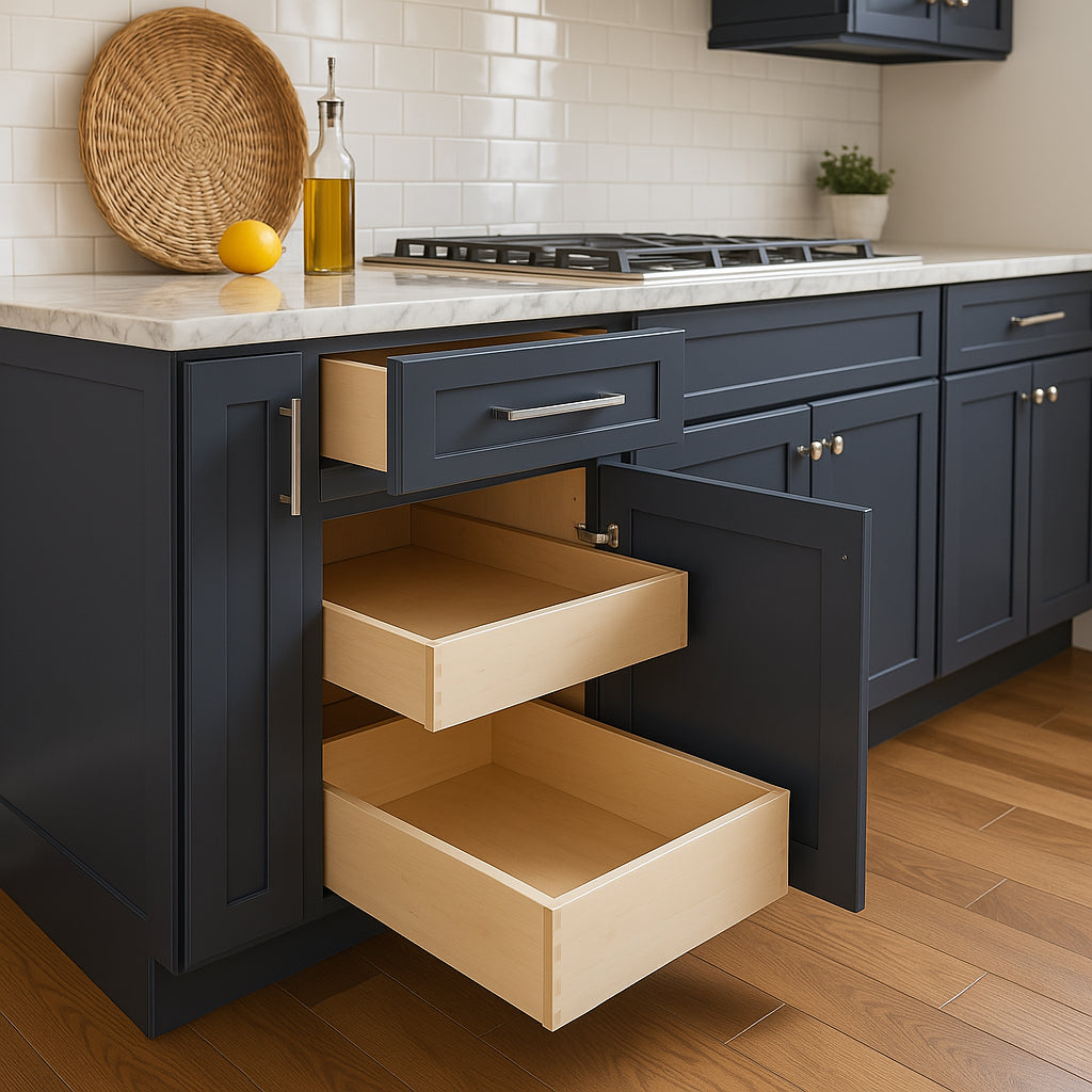 • Soft Close Features: Equipped with soft-close doors, drawers, and roll-out trays for a premium feel.