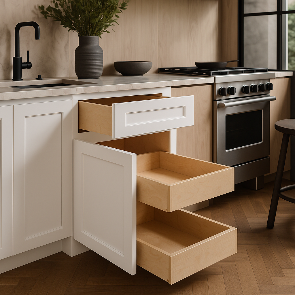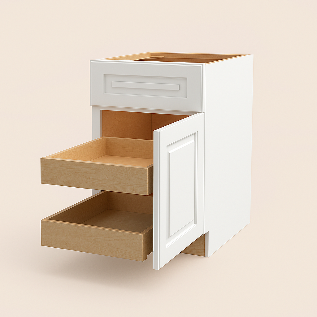 The Grayson Base Kitchen Cabinet combines durability and elegance with its CARB II compliant all-plywood construction and painted Pacific White finish. Featuring soft-close doors and full extension drawers, it offers smooth operation and a modern aesthetic.