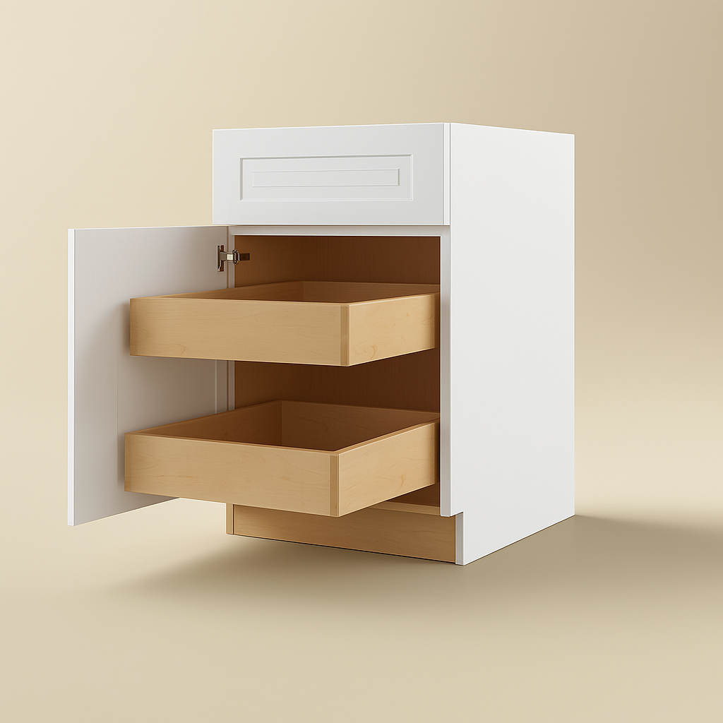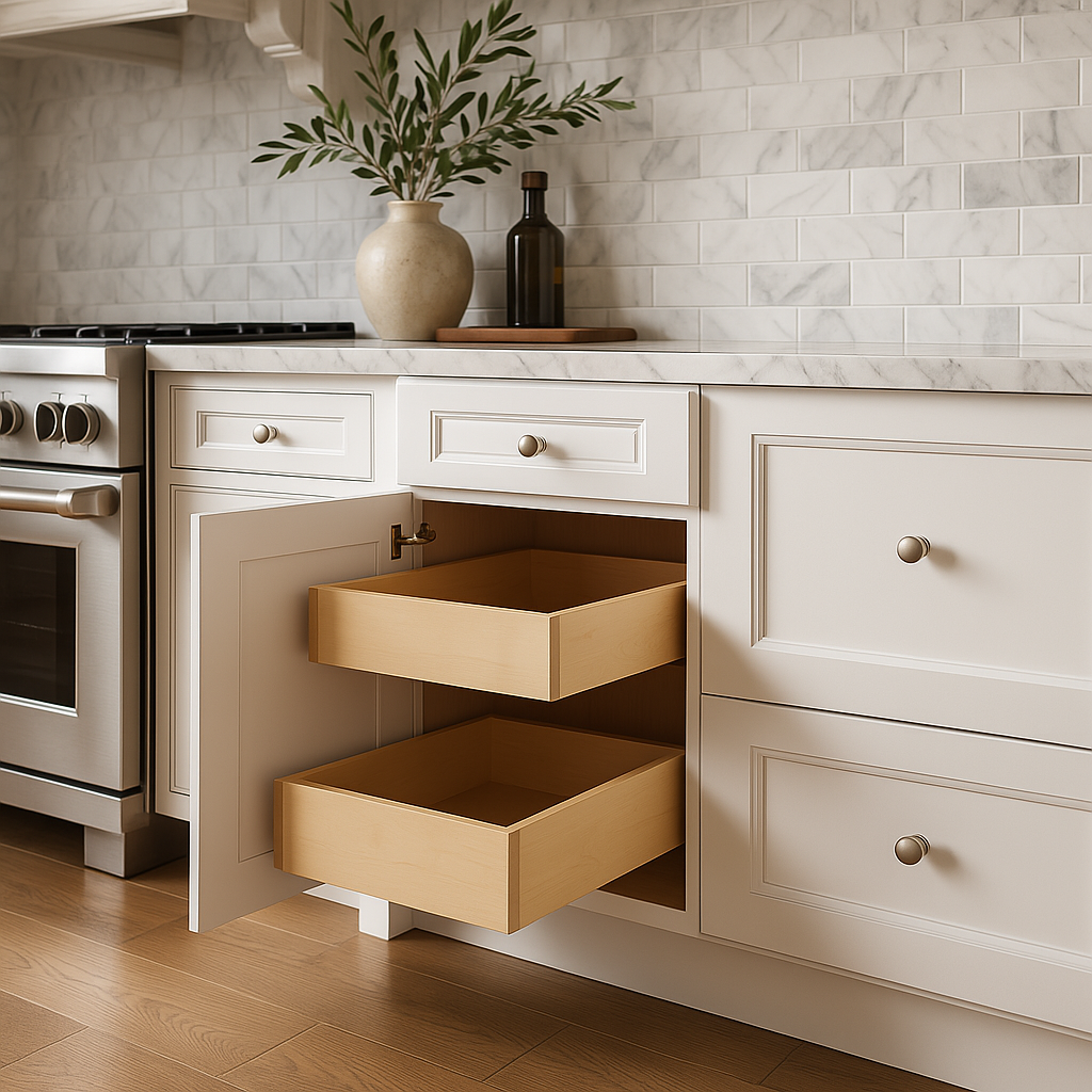 A: The soft-close mechanism uses concealed under-mount runners to gently shut the doors without noise or impact, prolonging cabinet life and reducing wear.