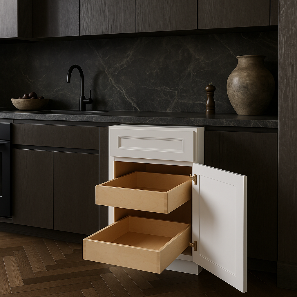• Functional Features: Includes full extension drawers and structural toe kicks for added stability.