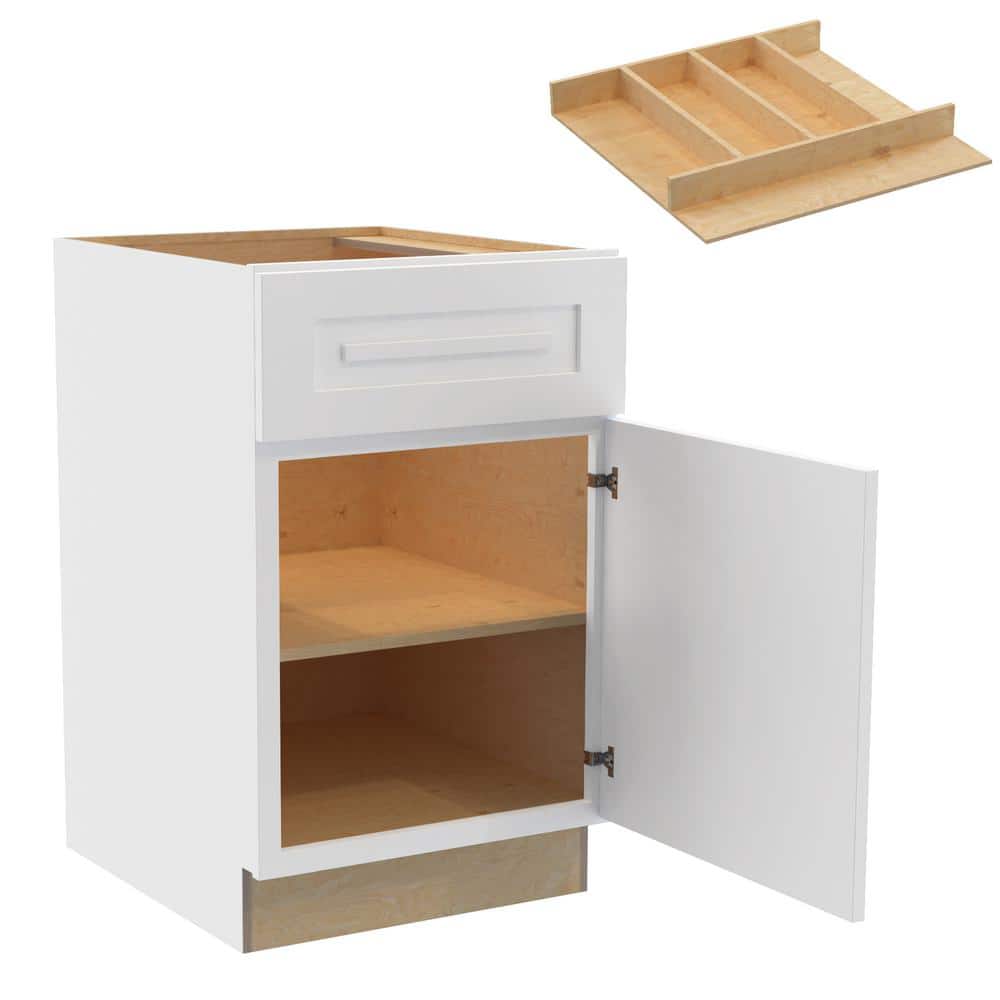 The Grayson cabinet by Home Decorators Collection combines durable all-plywood construction with a sophisticated Pacific White finish. Featuring soft-close doors and drawers, full-depth shelves, and roll-out trays, it offers both style and functionality for your kitchen.