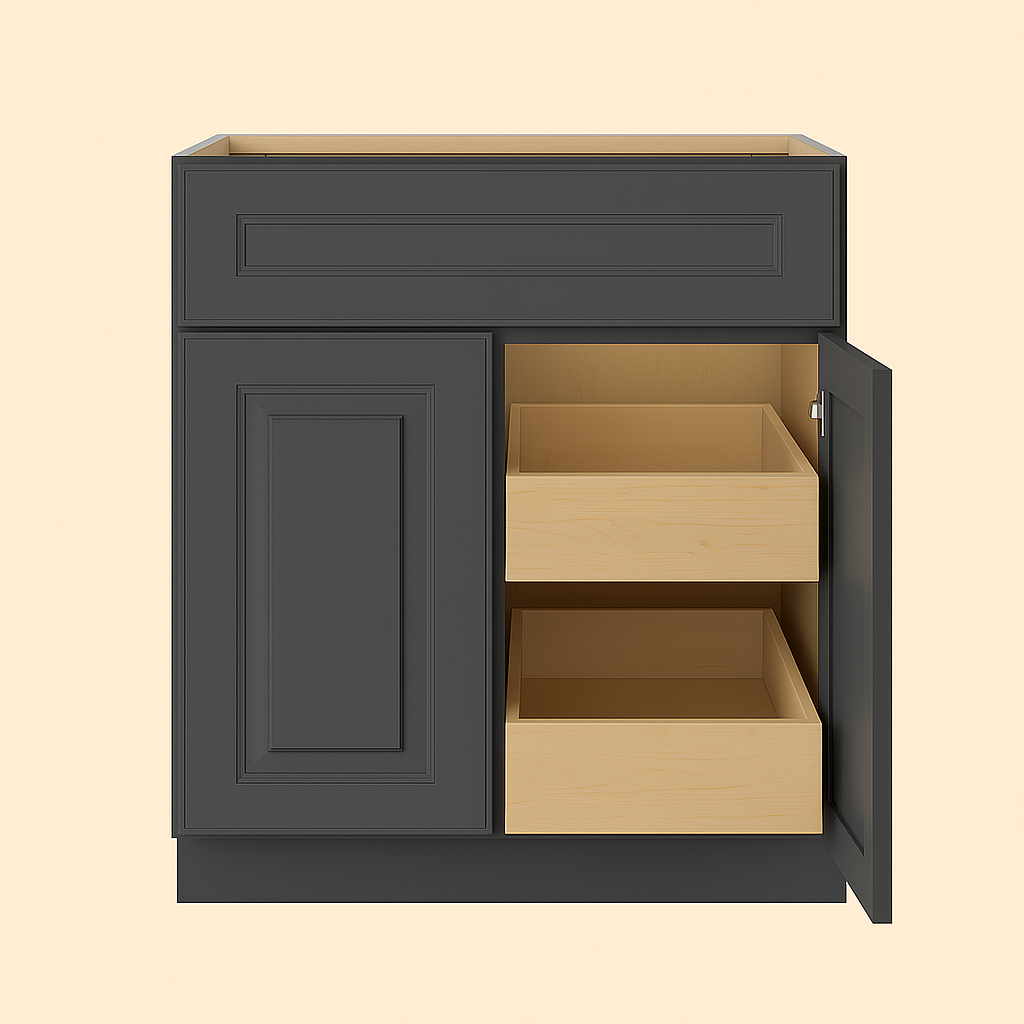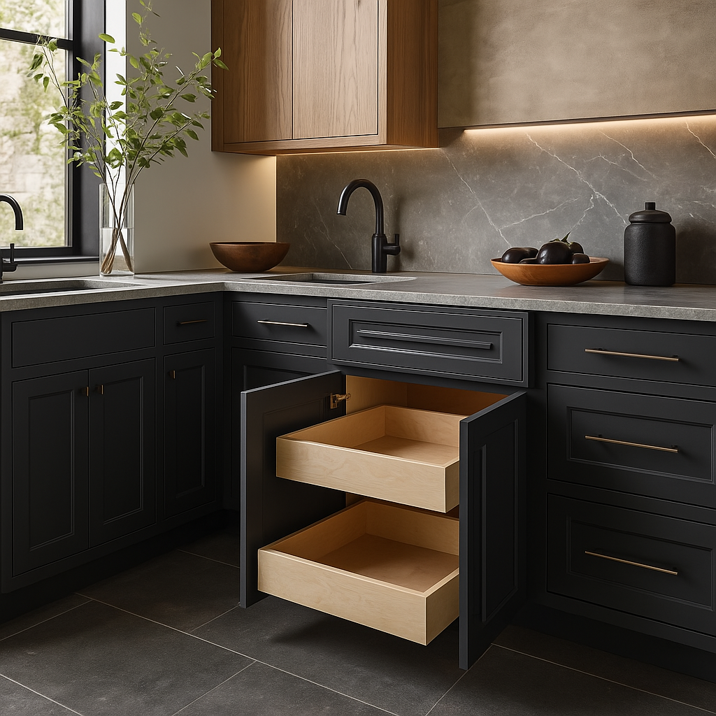 The Grayson cabinet in Deep Onyx is a masterpiece of design and functionality, bringing a bold yet sophisticated touch to your kitchen. Its rich, dark finish creates a striking contrast against lighter countertops and backsplashes, while the soft-close mechanisms ensure a seamless user experience. Pair it with brass or stainless steel accents to elevate its luxurious appeal. This cabinet is not just a storage solution but a statement piece that defines the heart of your home.