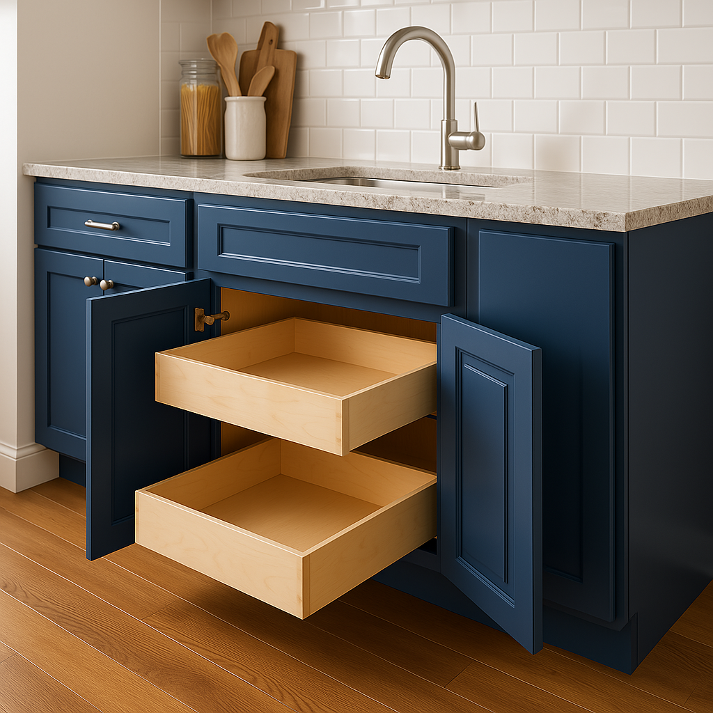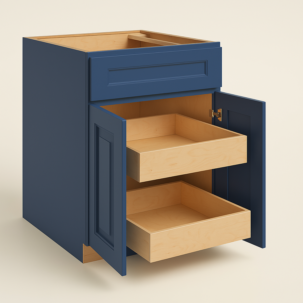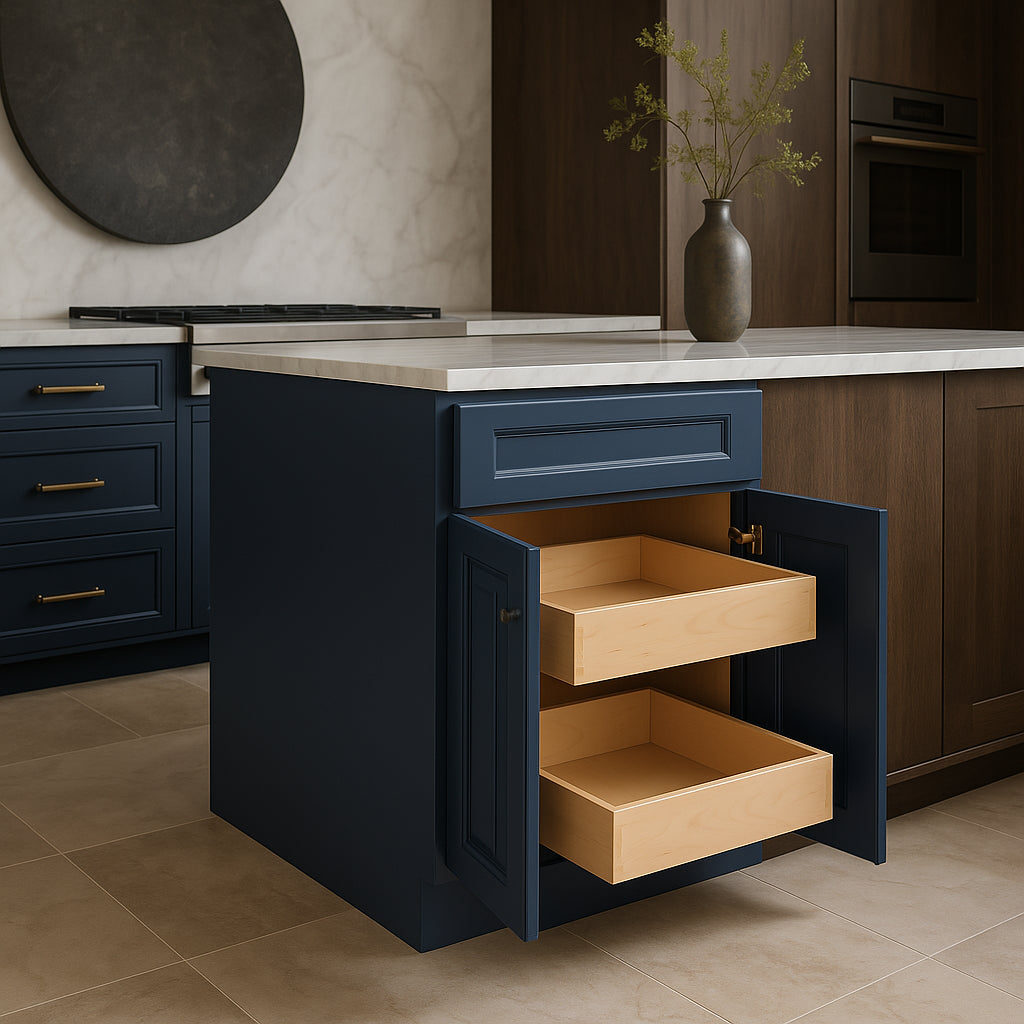 A: The soft-close roll-out trays can hold up to 90 lbs, making them perfect for heavy cookware and pantry items.
