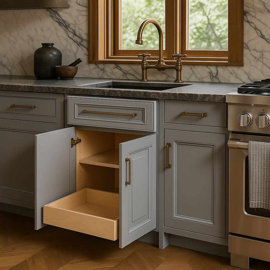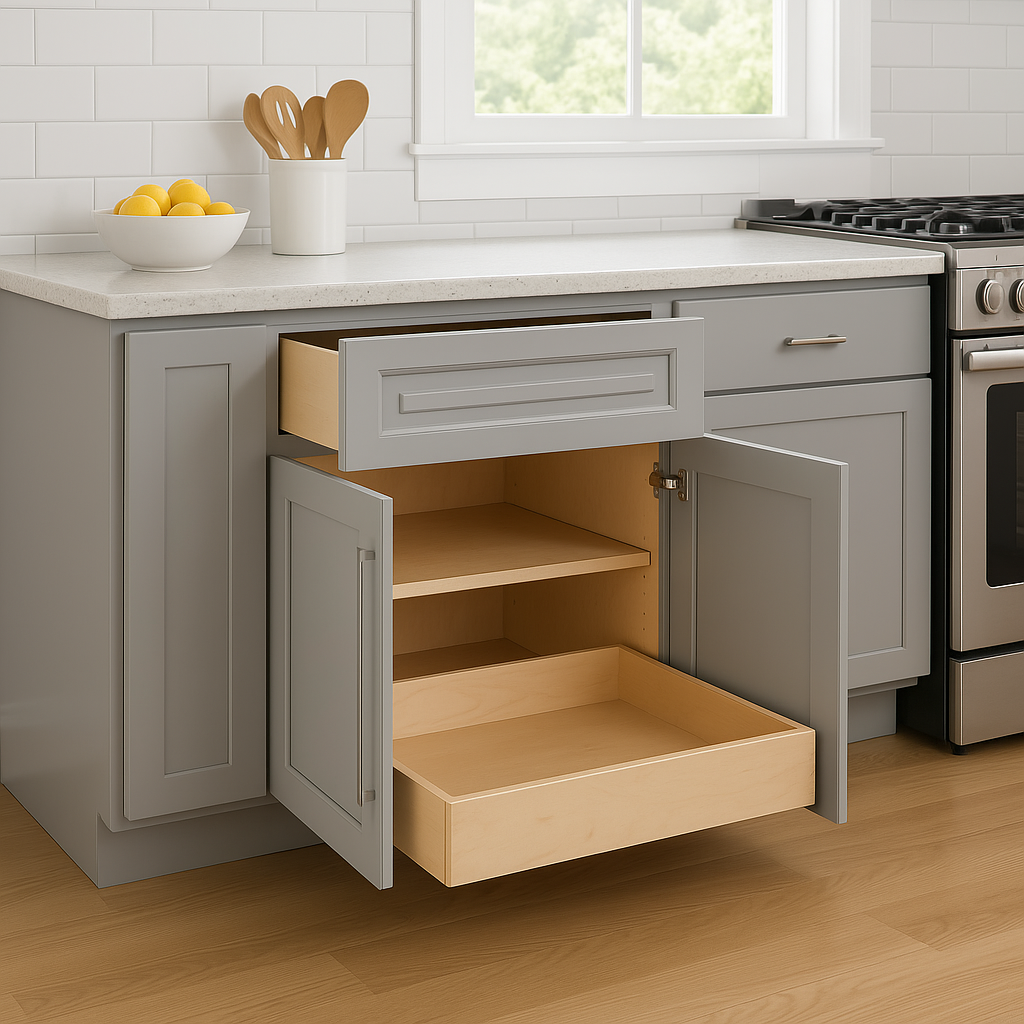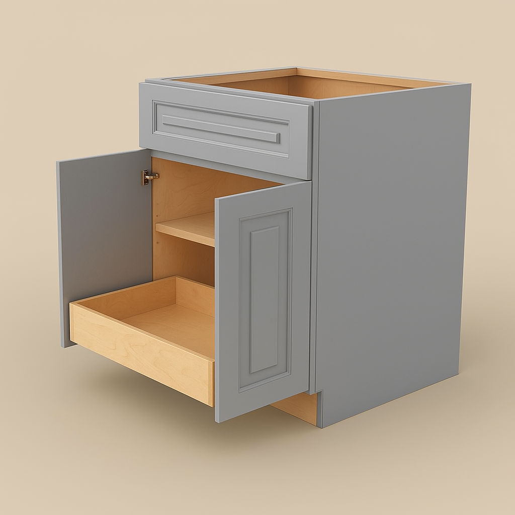The Grayson Pearl Gray Kitchen Cabinet combines premium all-plywood construction with a stylish pearl gray finish, offering durability and a modern aesthetic. Featuring soft-close doors and drawers, it provides a seamless and quiet user experience.