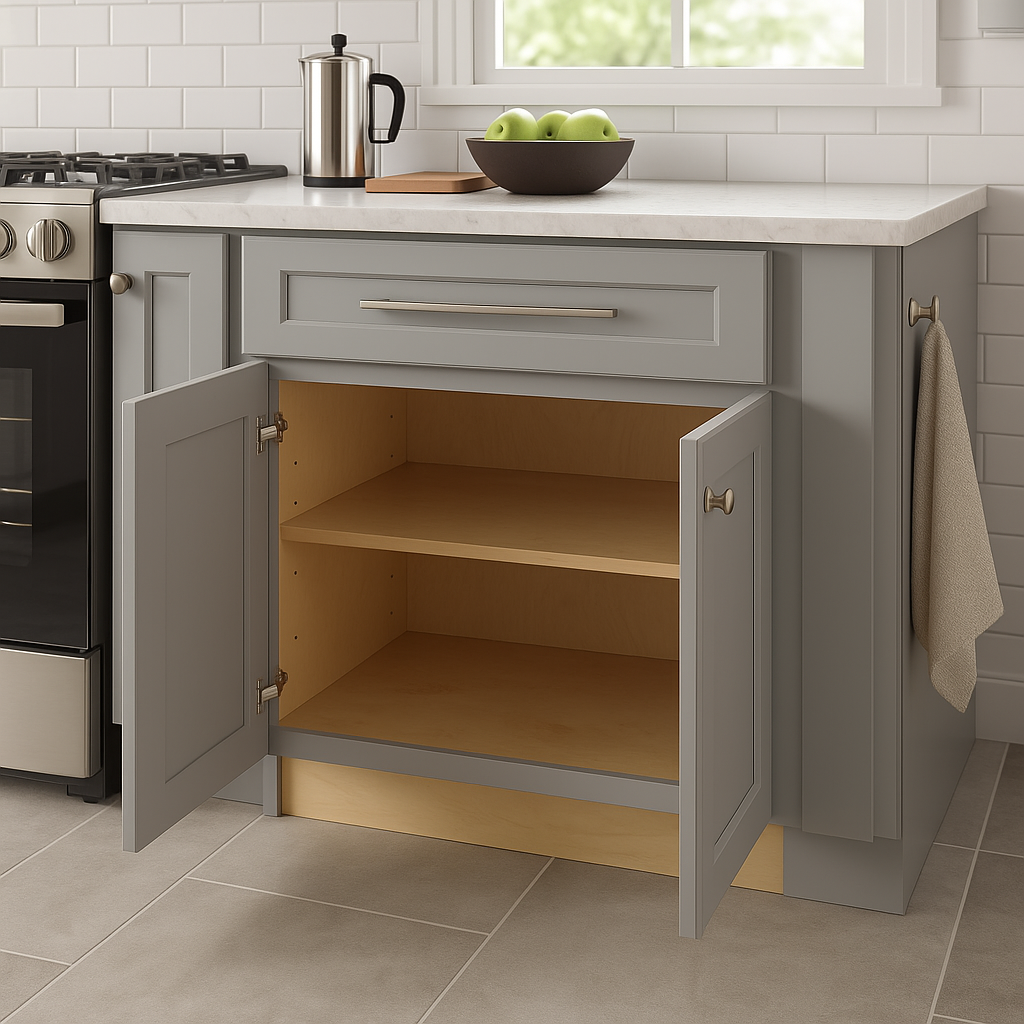 The Grayson Pearl Gray Base Kitchen Cabinet combines premium plywood construction with a soft-close mechanism and adjustable shelving, offering durability and elegance for a modern kitchen.