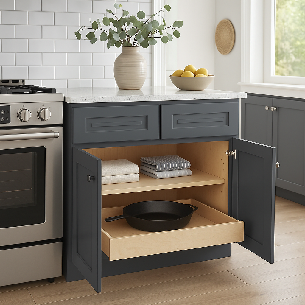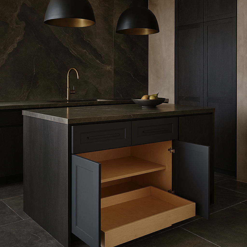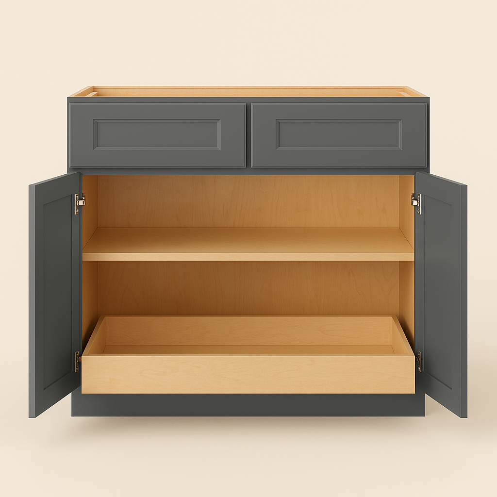 The Grayson 36" Onyx Base Kitchen Cabinet combines durable plywood construction with a sleek Deep Onyx finish, offering both style and functionality. Featuring soft-close doors and drawers, it ensures a quiet and elegant kitchen experience.