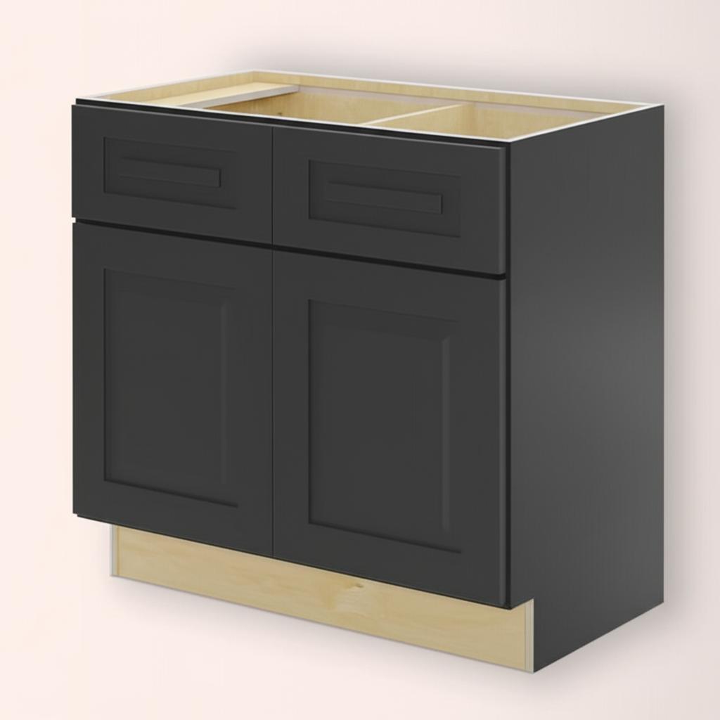 The Grayson 36" Kitchen Cabinet in Deep Onyx by Home Decorators Collection combines style and functionality. Crafted from durable plywood, it features a chic Transitional Shaker design with soft close mechanisms and adjustable shelves for optimal storage.