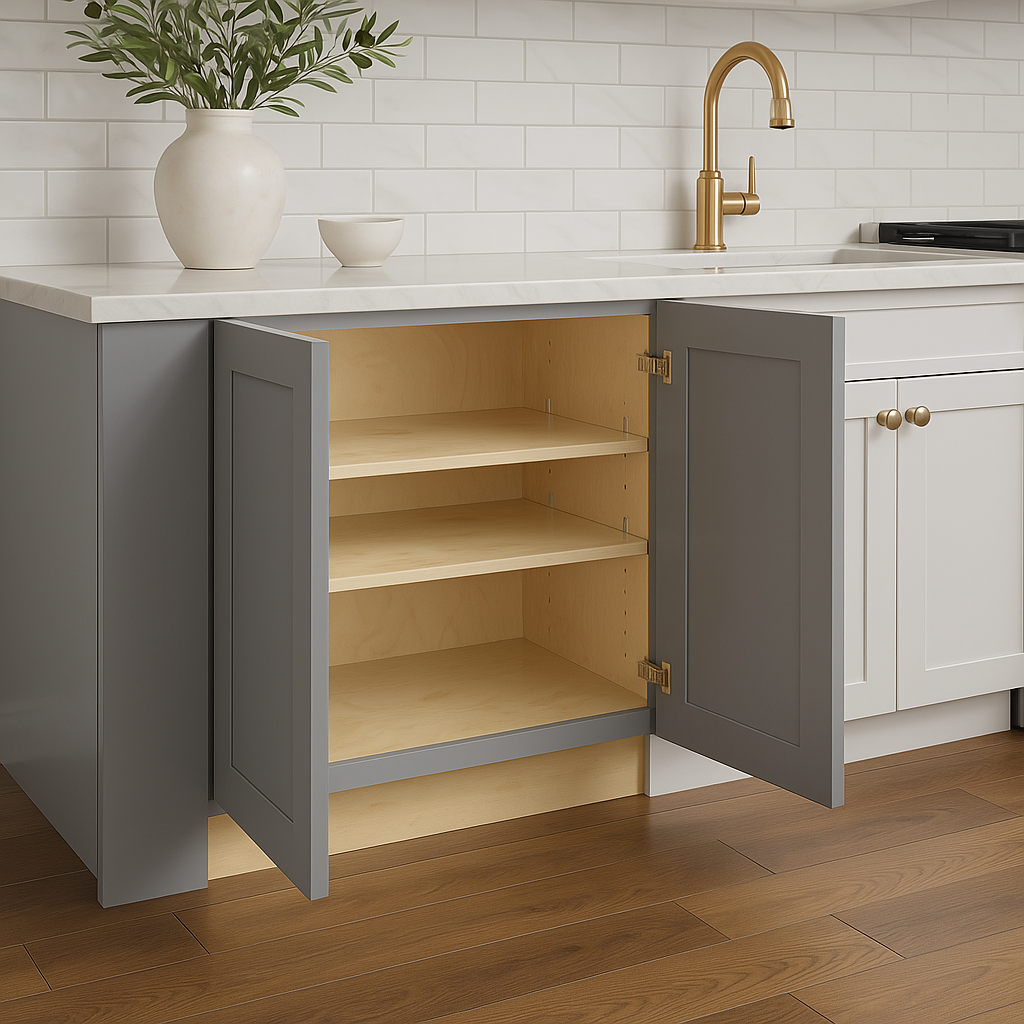 The Grayson Pearl Gray Kitchen Cabinet combines premium all-plywood construction with a soft-close door mechanism and adjustable shelves, offering durability, elegance, and versatile storage for your kitchen.