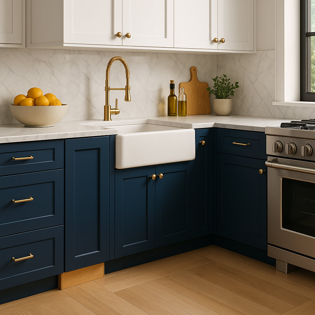 The Grayson Base Kitchen Cabinet in Mythic Blue combines robust plywood construction with a refined painted finish, offering durability and style. Featuring soft-close doors and adjustable shelves, this cabinet is designed for convenience and elegance.