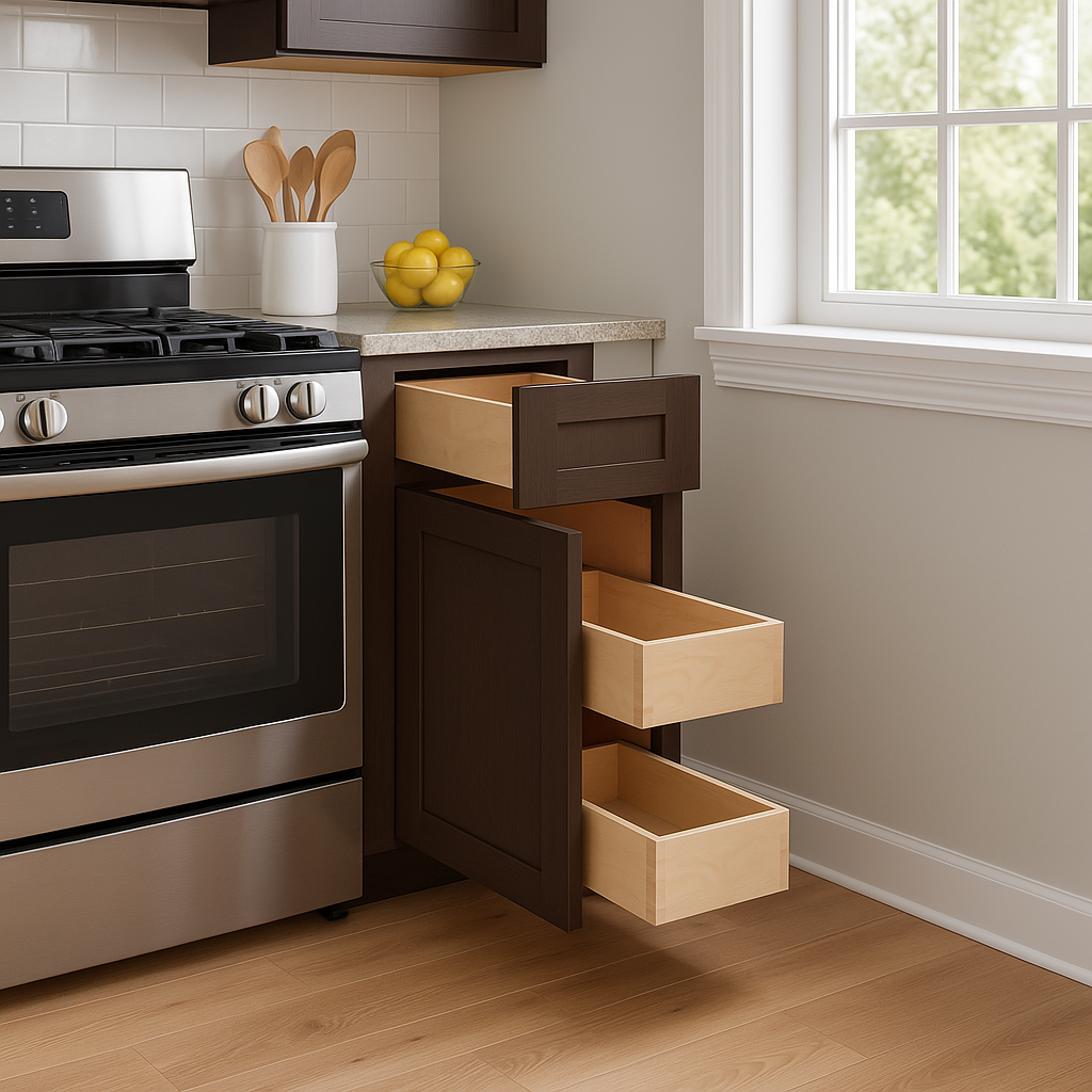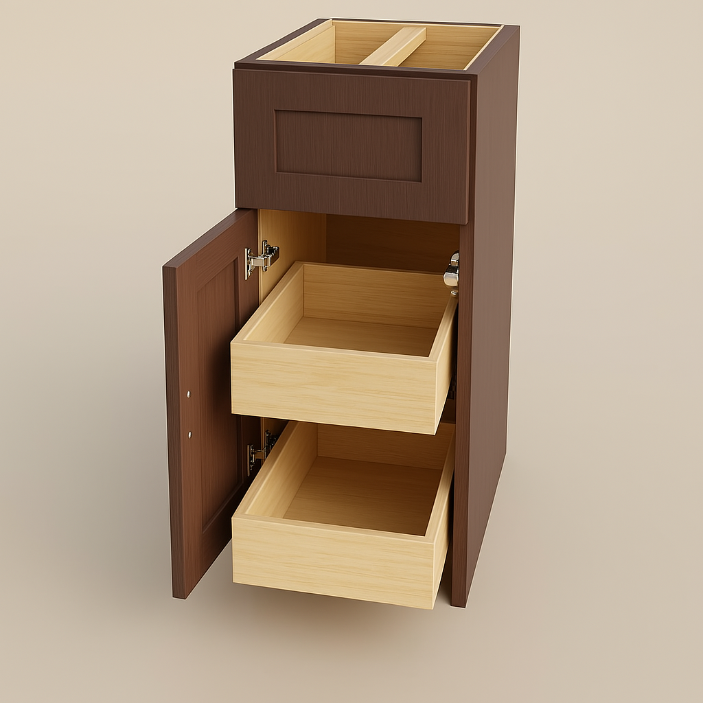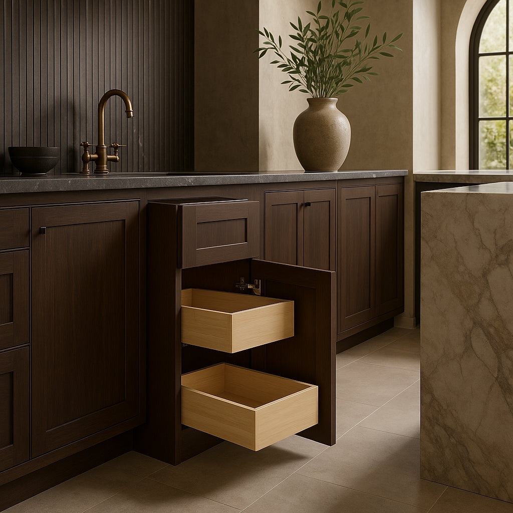 - Functionality: Soft-close mechanisms and dovetailed rollout trays ensure smooth operation and accessibility.