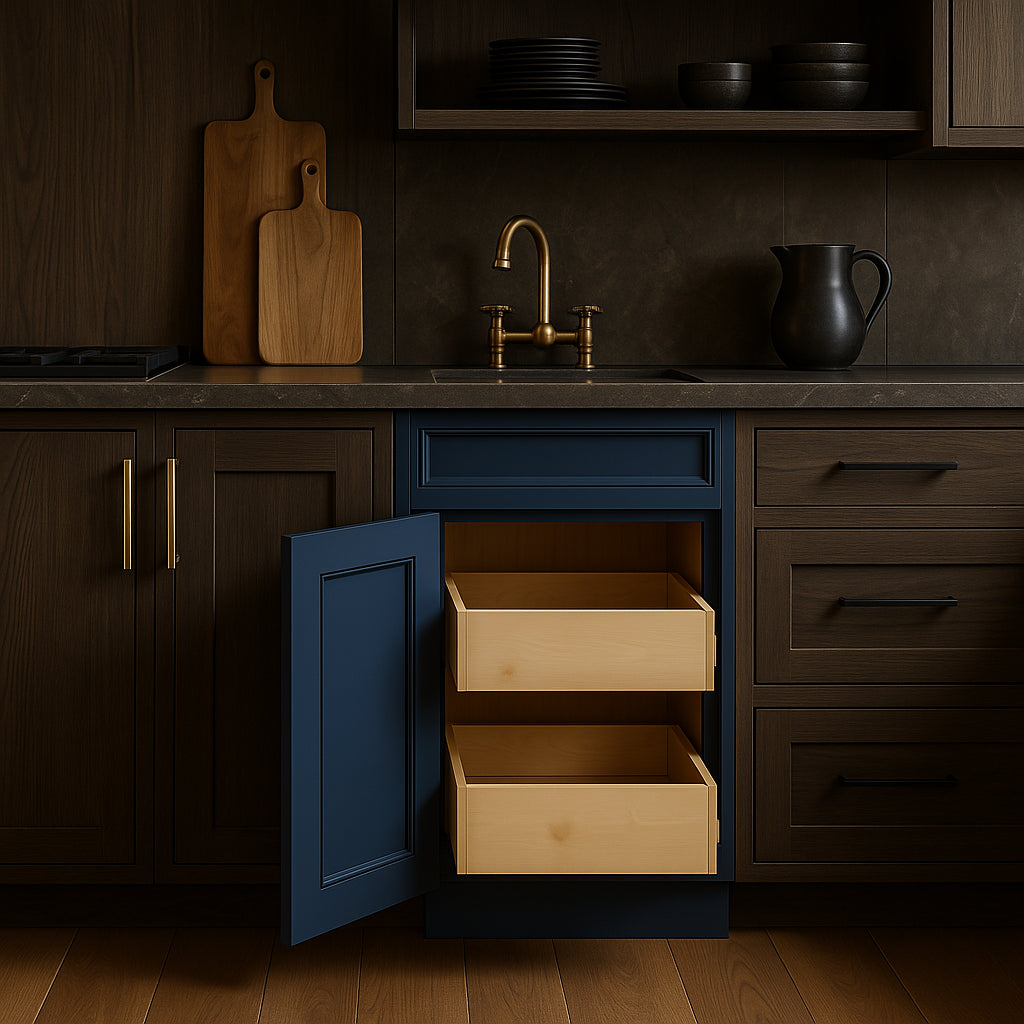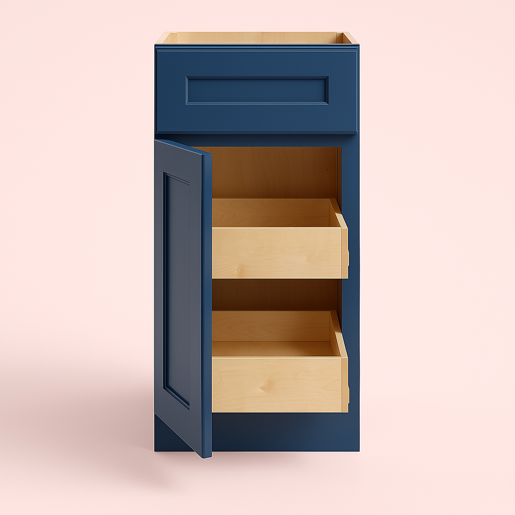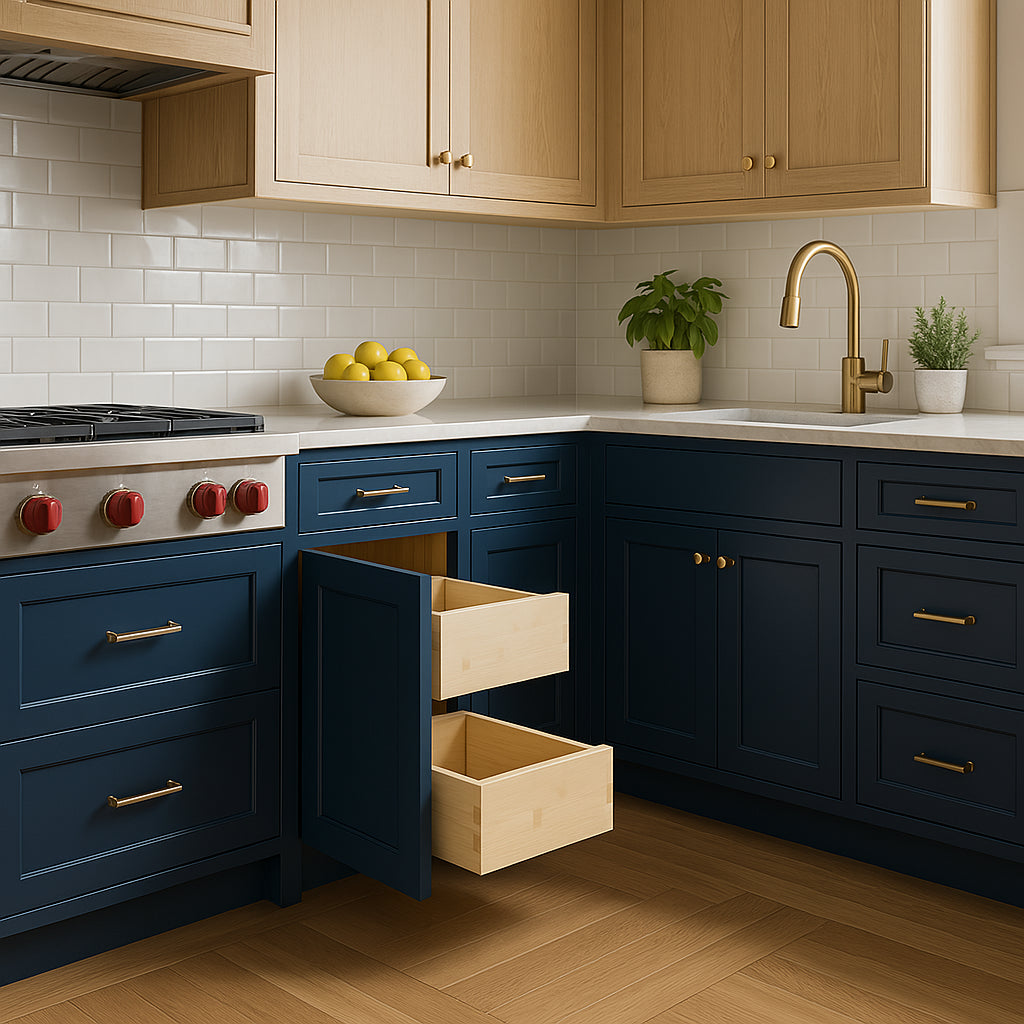- Elegant Design: Shaker-style doors with flat recessed panels and a bold Mythic Blue finish.