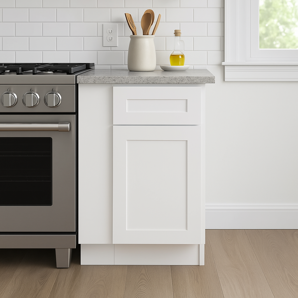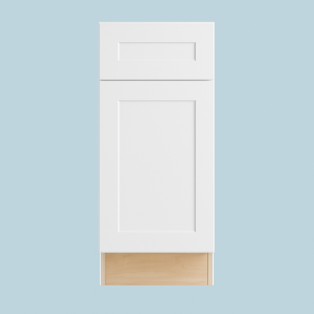 The Newport Base Cabinet in Pacific White combines timeless shaker-style design with modern functionality. Made with durable CARB II compliant plywood, it features soft-close doors and drawers, adjustable shelving, and a scuff-resistant painted finish.