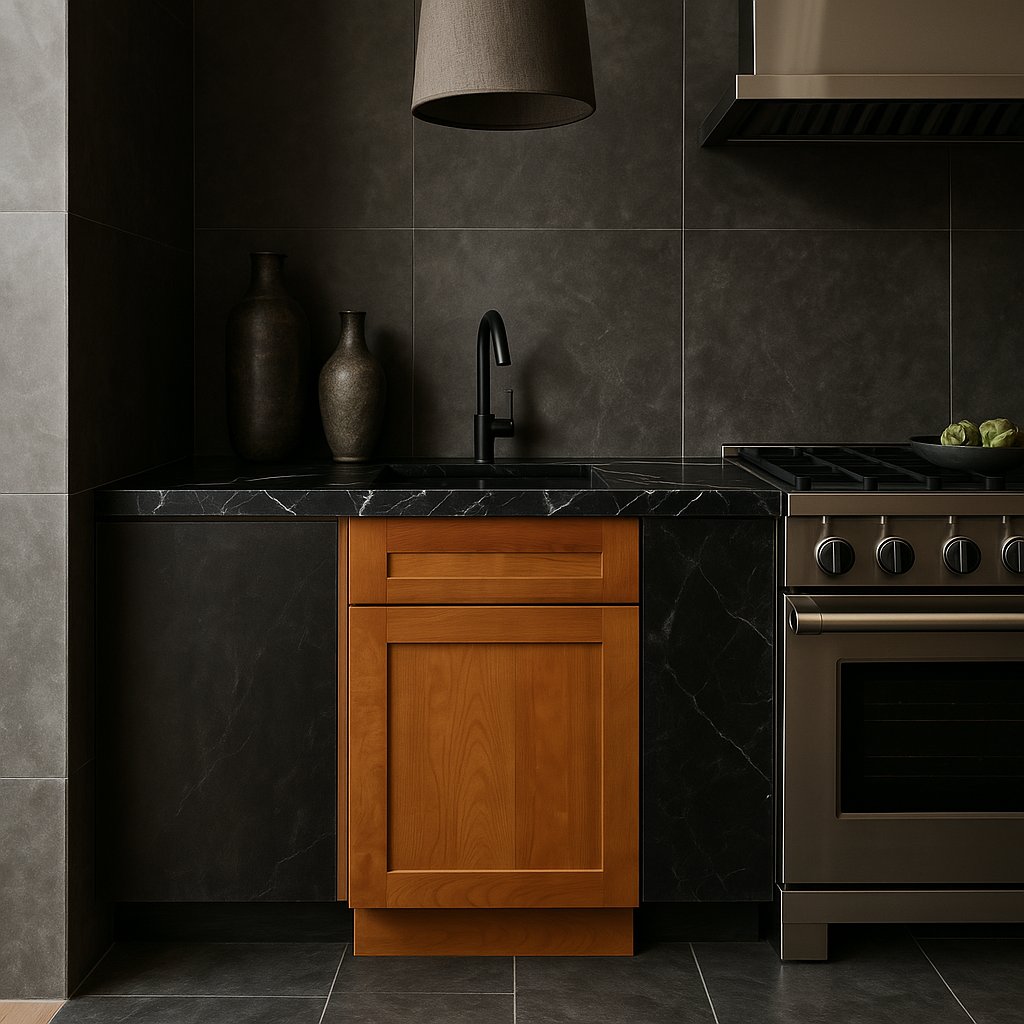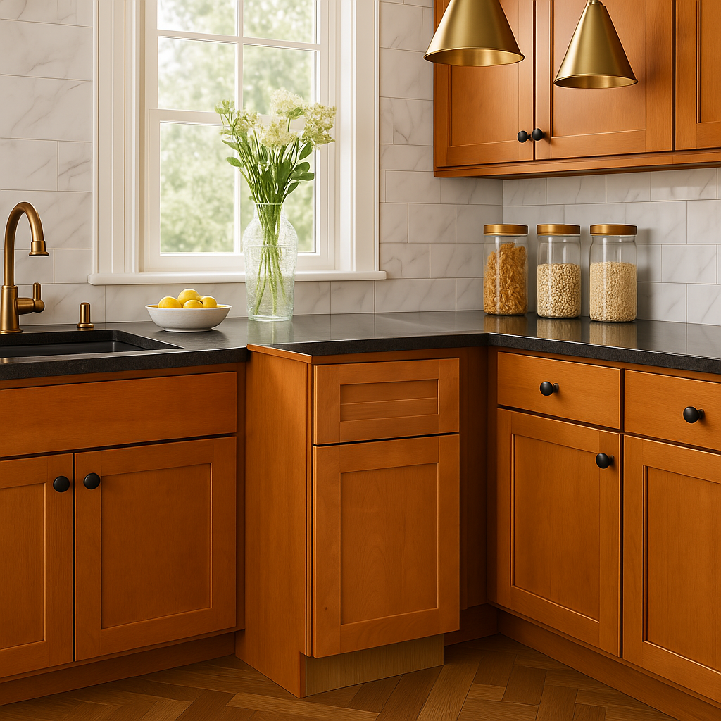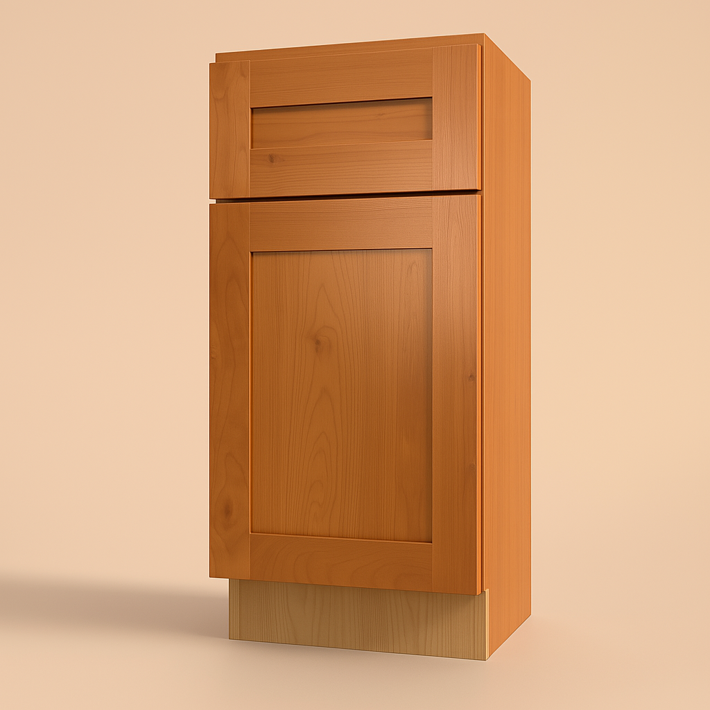 • Elegant Design: Shaker-inspired doors with a warm cinnamon stain for a timeless aesthetic.