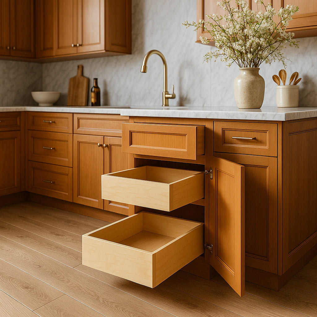 The Newport Kitchen Cabinet combines Shaker-inspired design with durable plywood construction and a warm cinnamon finish. Featuring soft-close doors and dovetail rollout trays, it offers both style and functionality for modern and traditional kitchens.