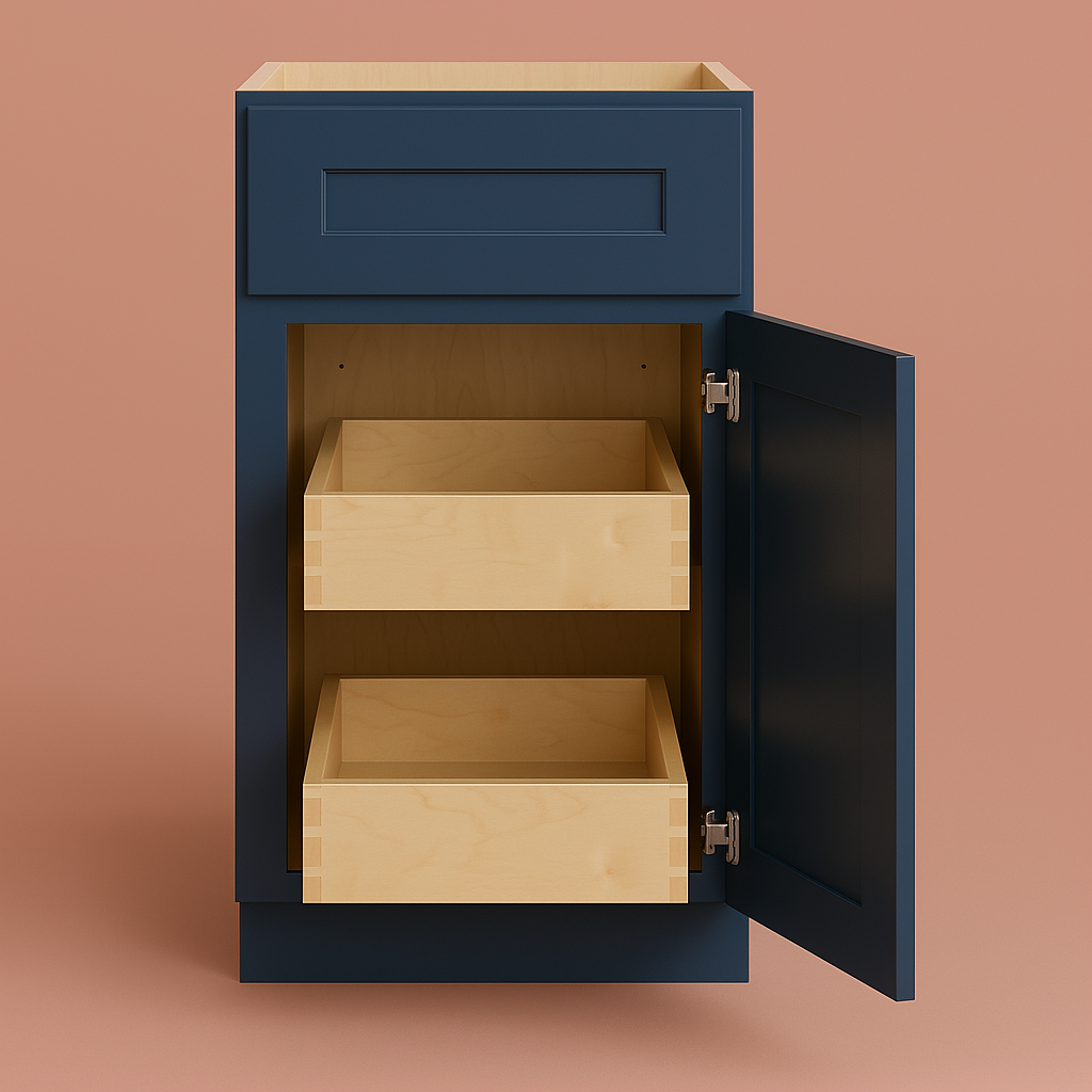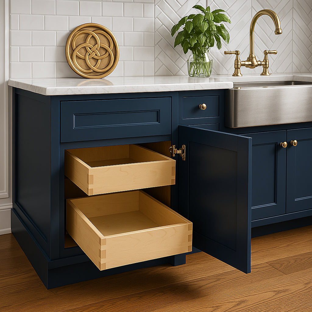 The Mythic Blue Kitchen Cabinet is a masterpiece of design and functionality, bringing a bold yet timeless charm to your kitchen. Its Shaker-style doors and drawers, paired with the rich Mythic Blue finish, create a striking visual impact that complements both modern and traditional interiors. Style it with brushed nickel hardware for a sophisticated touch or pair it with light countertops to highlight its vibrant hue. This cabinet is not just a storage solution but a statement piece that elevates your culinary space to new heights of elegance.