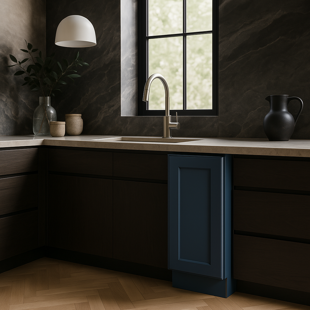 Enhance your kitchen with the Newport Cabinet in Mythic Blue—order now for a blend of style and functionality.
