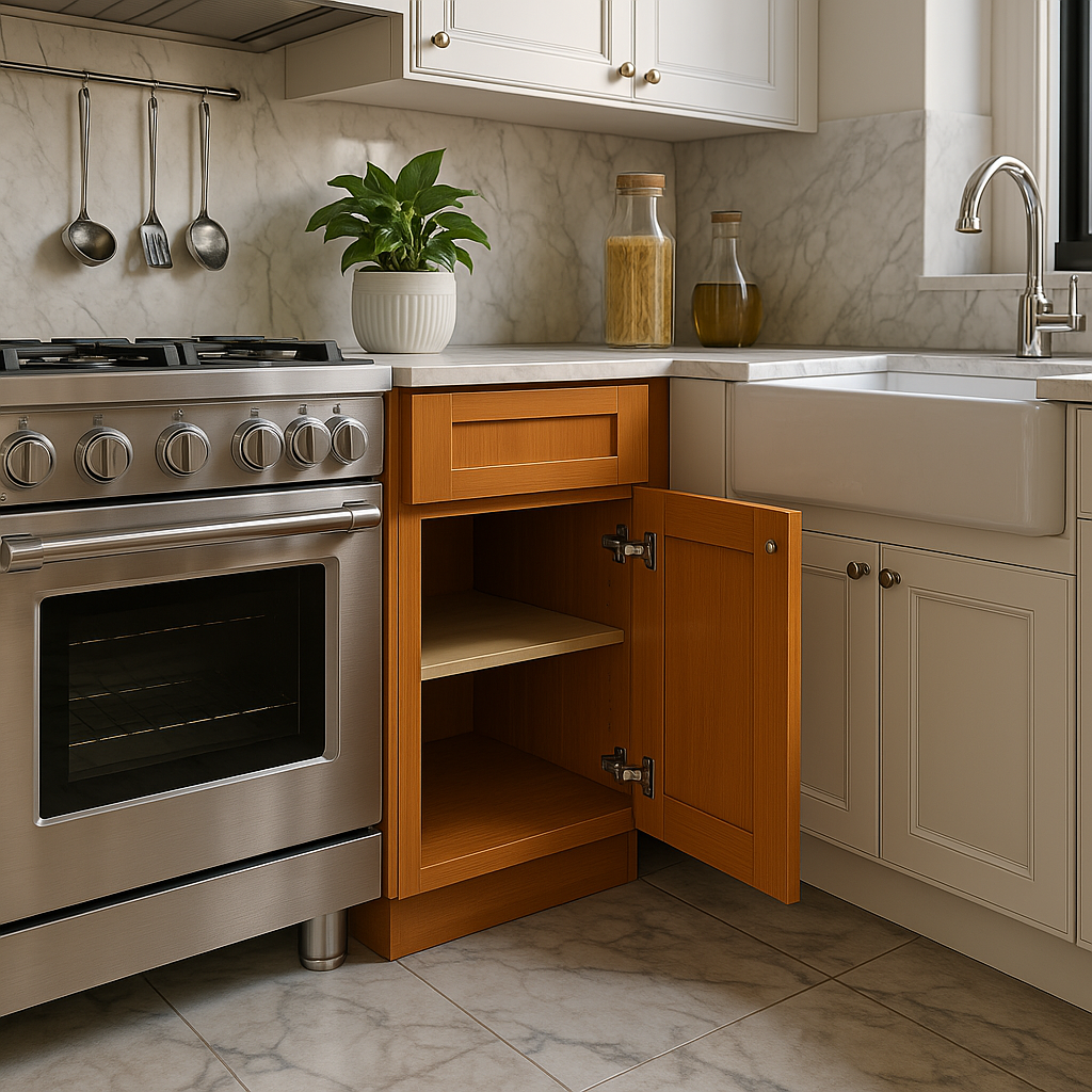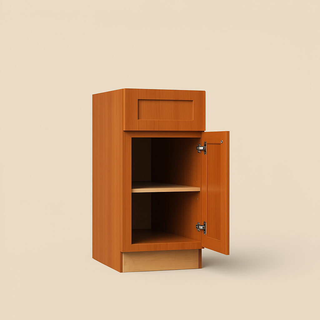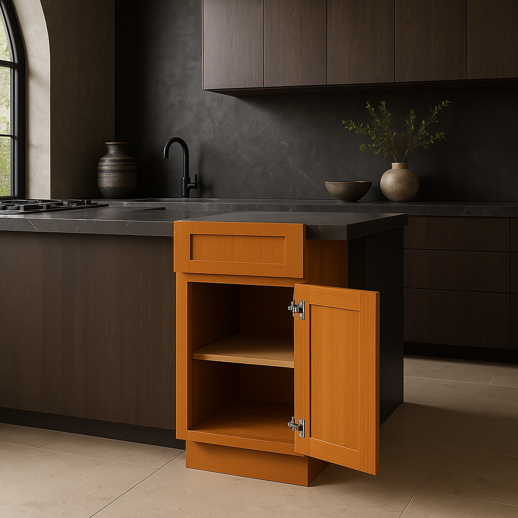 The Newport Kitchen Base Cabinet in Cinnamon combines timeless Shaker-style design with durable plywood construction. Featuring soft-close doors and drawers, it offers both elegance and functionality for a sophisticated kitchen upgrade.