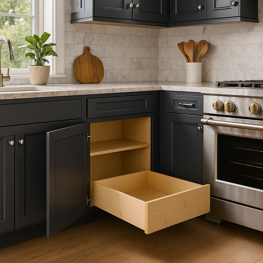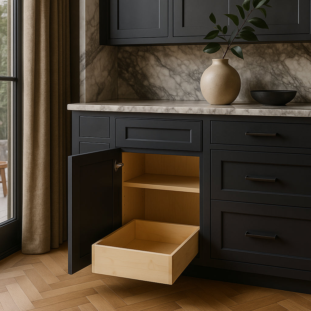 The Newport Base Kitchen Cabinet in Deep Onyx by Home Decorators Collection combines bold sophistication with practical functionality. Featuring CARB-compliant plywood construction, soft-close hinges, and adjustable shelving, this cabinet is a durable and stylish addition to any kitchen.