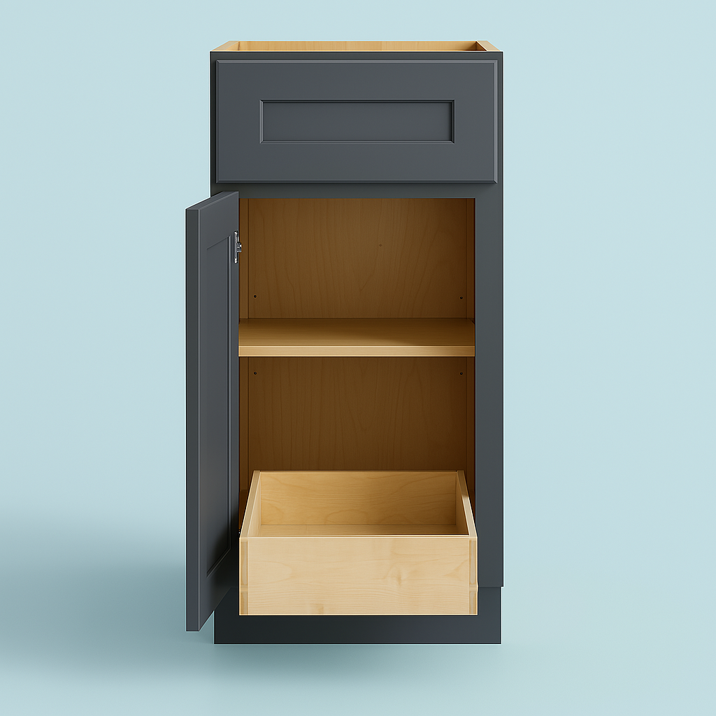 The Newport Base Kitchen Cabinet in Deep Onyx is a masterpiece of modern design, blending bold sophistication with practical functionality. Its shaker-style doors and multi-step painted finish create a striking geometric profile that enhances any kitchen space. Pair it with light countertops and metallic accents for a contemporary contrast that exudes luxury. This cabinet is not just a storage solution but a statement piece that transforms your kitchen into a realm of refined elegance.