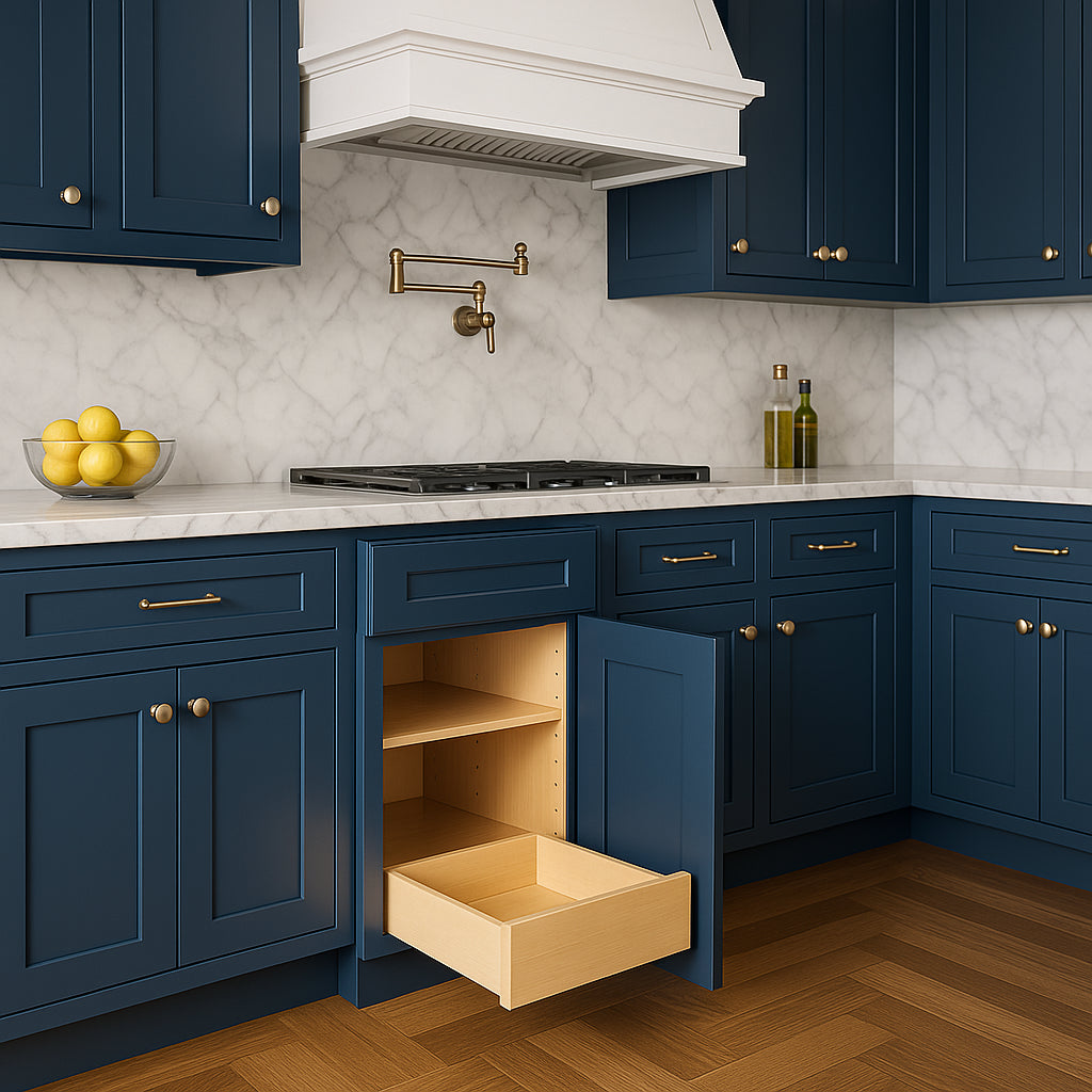 The Newport Mythic Blue kitchen base cabinet combines durable plywood construction with elegant shaker-style design. Featuring soft-close technology and adjustable shelving, it offers both functionality and sophistication for your kitchen.