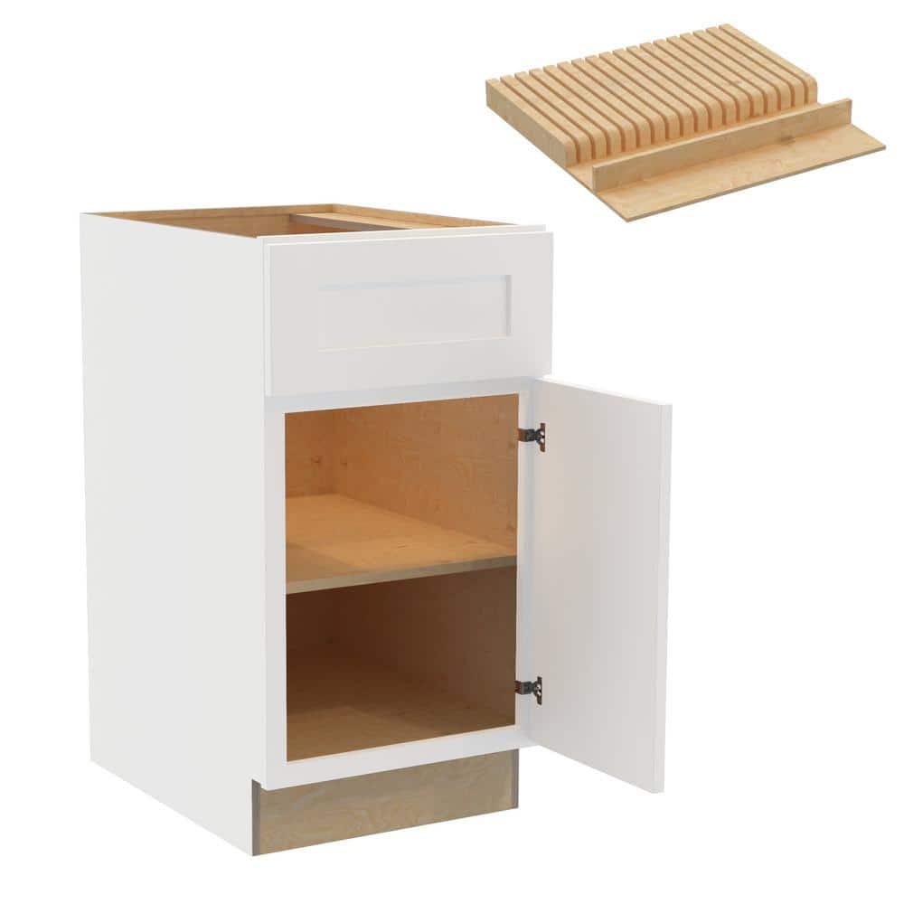 The Newport Kitchen Cabinet by Home Decorators Collection combines durable all-plywood construction with a sleek Pacific White finish. Featuring soft-close doors and drawers, adjustable shelves, and an integrated knife block, this cabinet is both functional and stylish.
