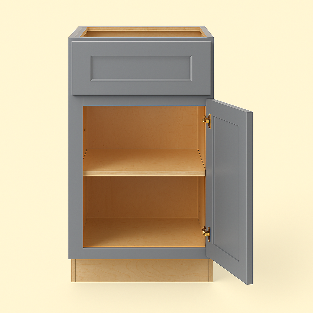 The Newport Base Kitchen Cabinet in Pearl Gray combines durable plywood construction with a stylish shaker design. Featuring soft-close doors and adjustable shelves, it offers both elegance and practicality for modern kitchens.