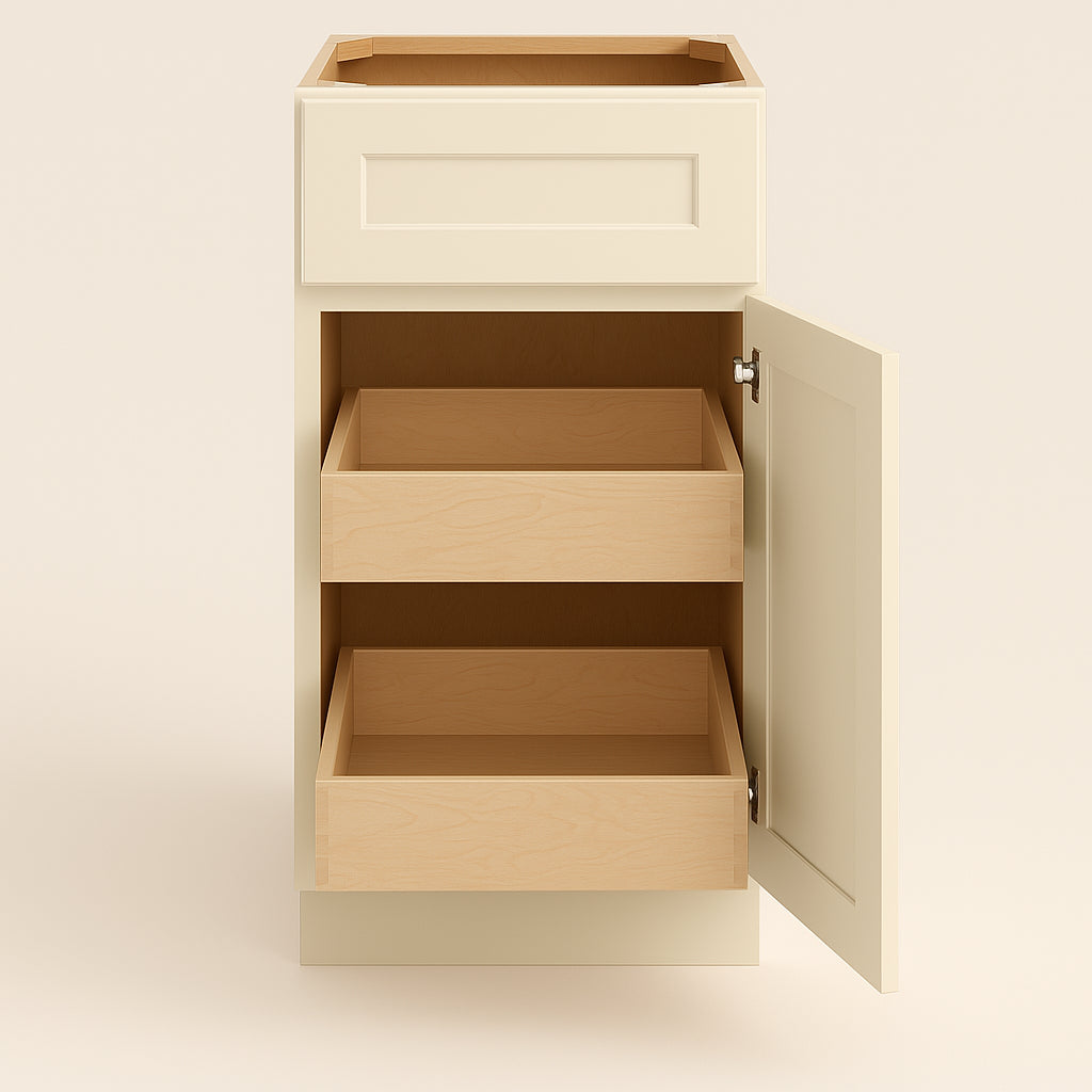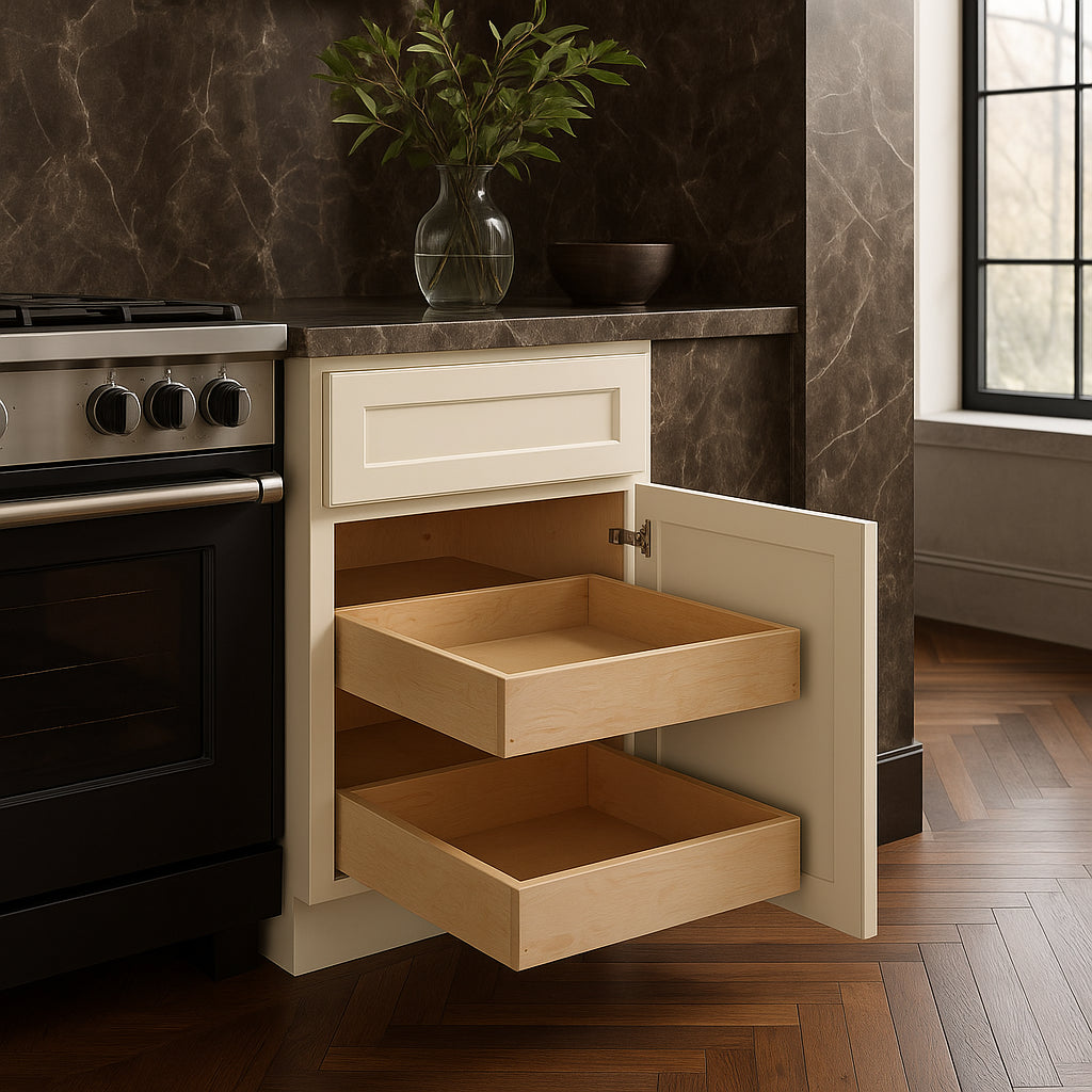 - Functional Storage: Includes two soft-close roll-out trays with a spice tray insert for organized storage.