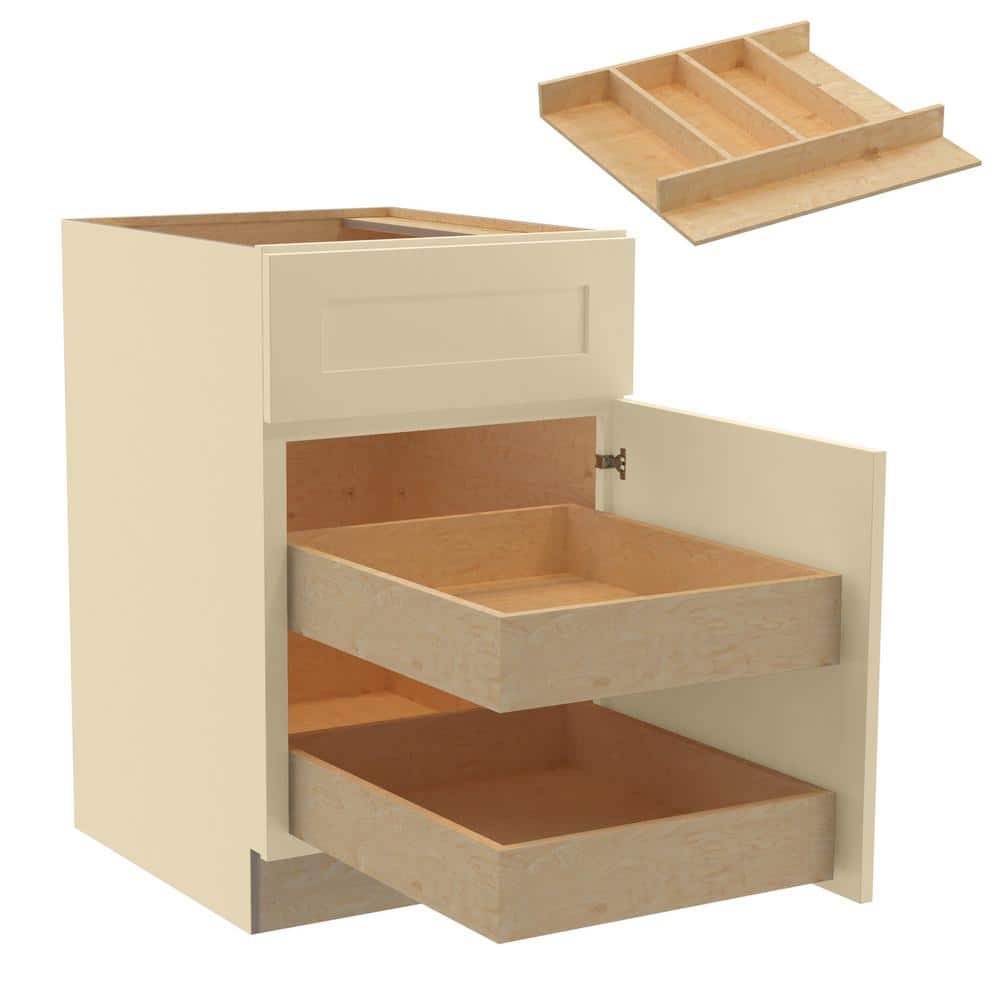 The Newport Blended Cream Kitchen Cabinet by Home Decorators Collection combines timeless Shaker-style design with modern functionality. Crafted from durable CARB-compliant plywood, it features soft-close doors, adjustable shelves, and roll-out trays for organized storage.