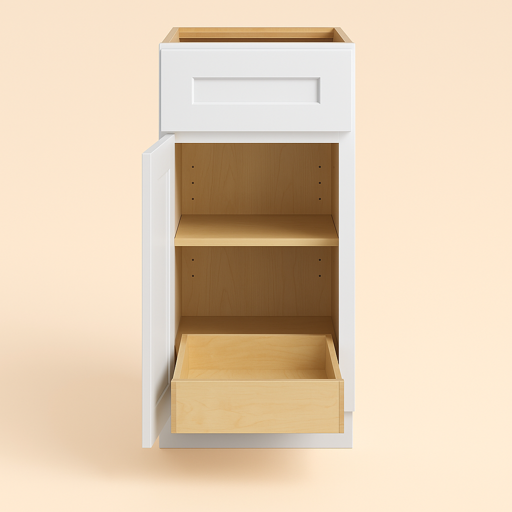 The Newport Base Kitchen Cabinet combines durable CARB-compliant plywood construction with a chic Pacific White finish. Featuring soft-close doors and dovetail drawers, it offers smooth functionality and a modern Shaker-style design.