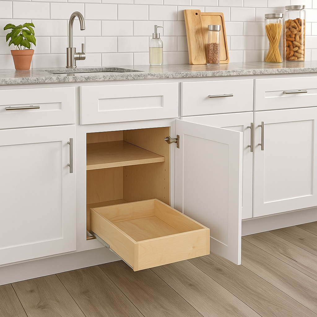 The Newport Kitchen Cabinet combines classic shaker design with modern functionality. Featuring CARB II compliant all-plywood construction and a multi-step painted finish in Pacific White, it offers durability and elegance for a timeless kitchen setting.