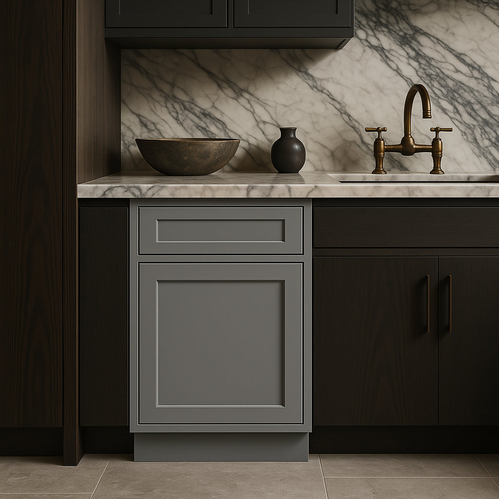 A: While the cabinet is a standalone unit, you can tailor your kitchen's aesthetics using the free online design service provided by Home Decorators Collection.