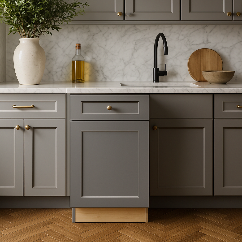 The Newport Pearl Gray Kitchen Cabinet combines durable plywood construction with a sleek shaker-style design, offering both functionality and modern elegance. Its soft-close drawers and adjustable shelves make it a versatile addition to any kitchen.