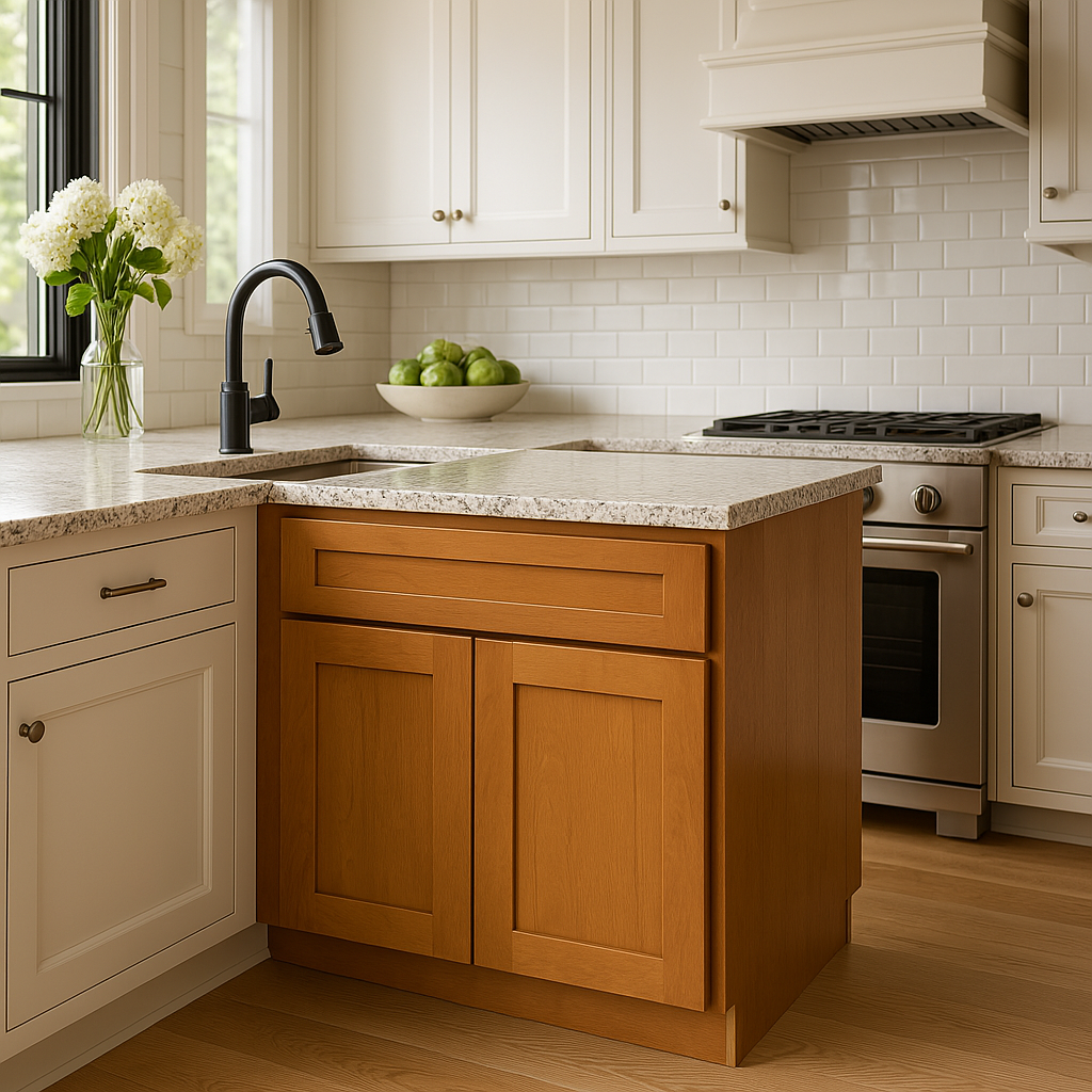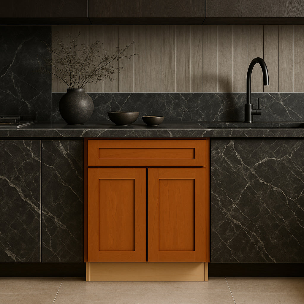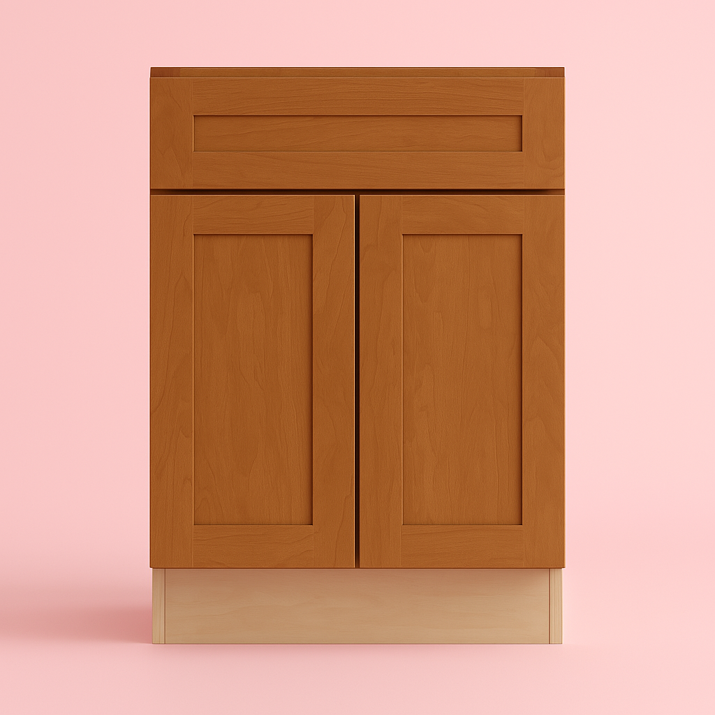 • Stylish Design: Shaker-style doors with a warm cinnamon finish highlight the natural wood grain.