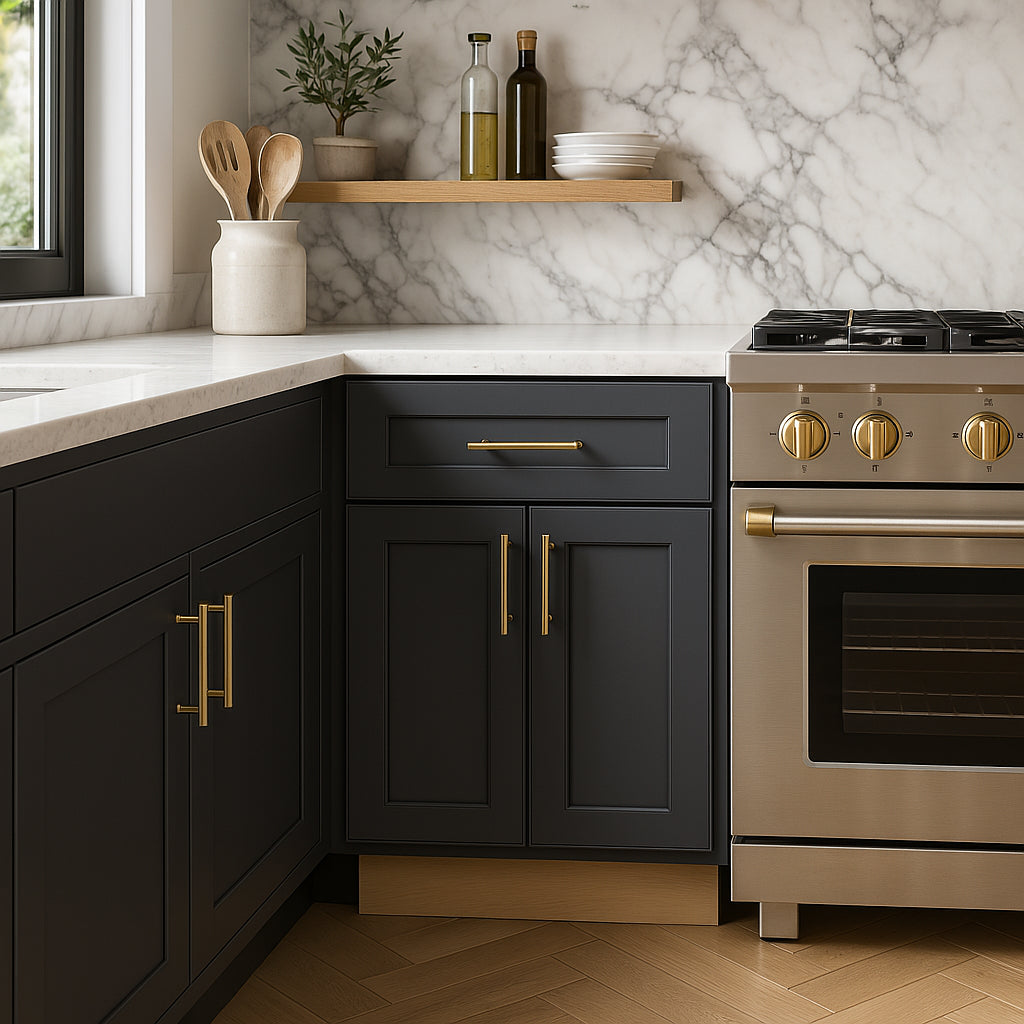 The Newport Deep Onyx kitchen cabinet combines modern design with practical features, including soft-close doors and adjustable shelves. Crafted from CARB-compliant plywood and MDF, it offers durability and a sleek aesthetic.