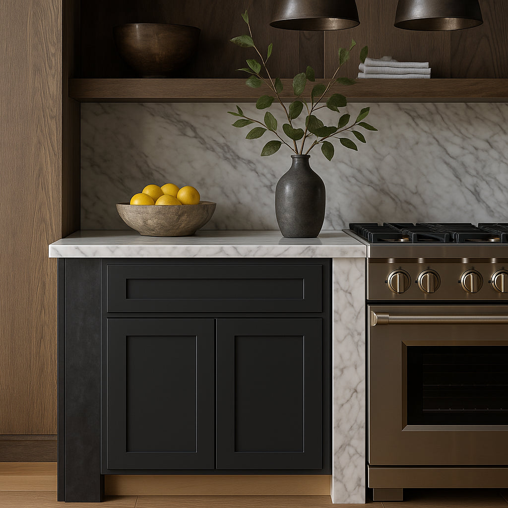 - Design: Shaker-style MDF doors with flat, recessed panels in a bold Deep Onyx finish.