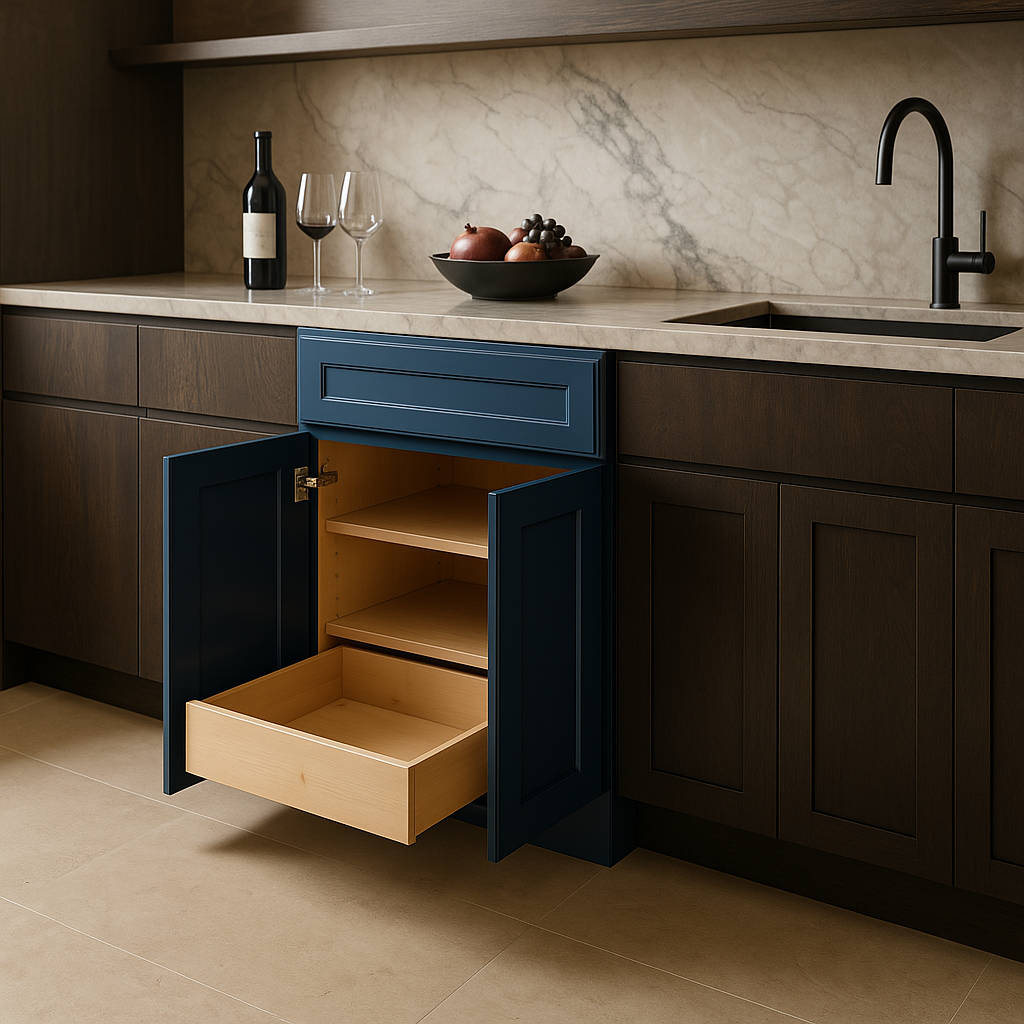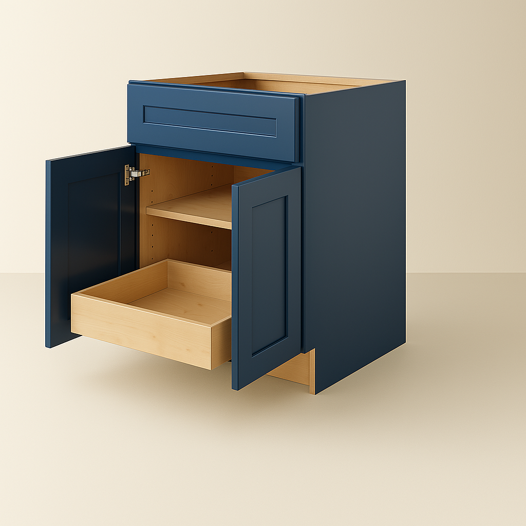 The Newport Mythic Blue Kitchen Cabinet combines durable all-plywood construction with a bold mythic blue finish, offering both style and functionality. Its Shaker-style design and soft-close features make it a perfect addition to any modern kitchen.