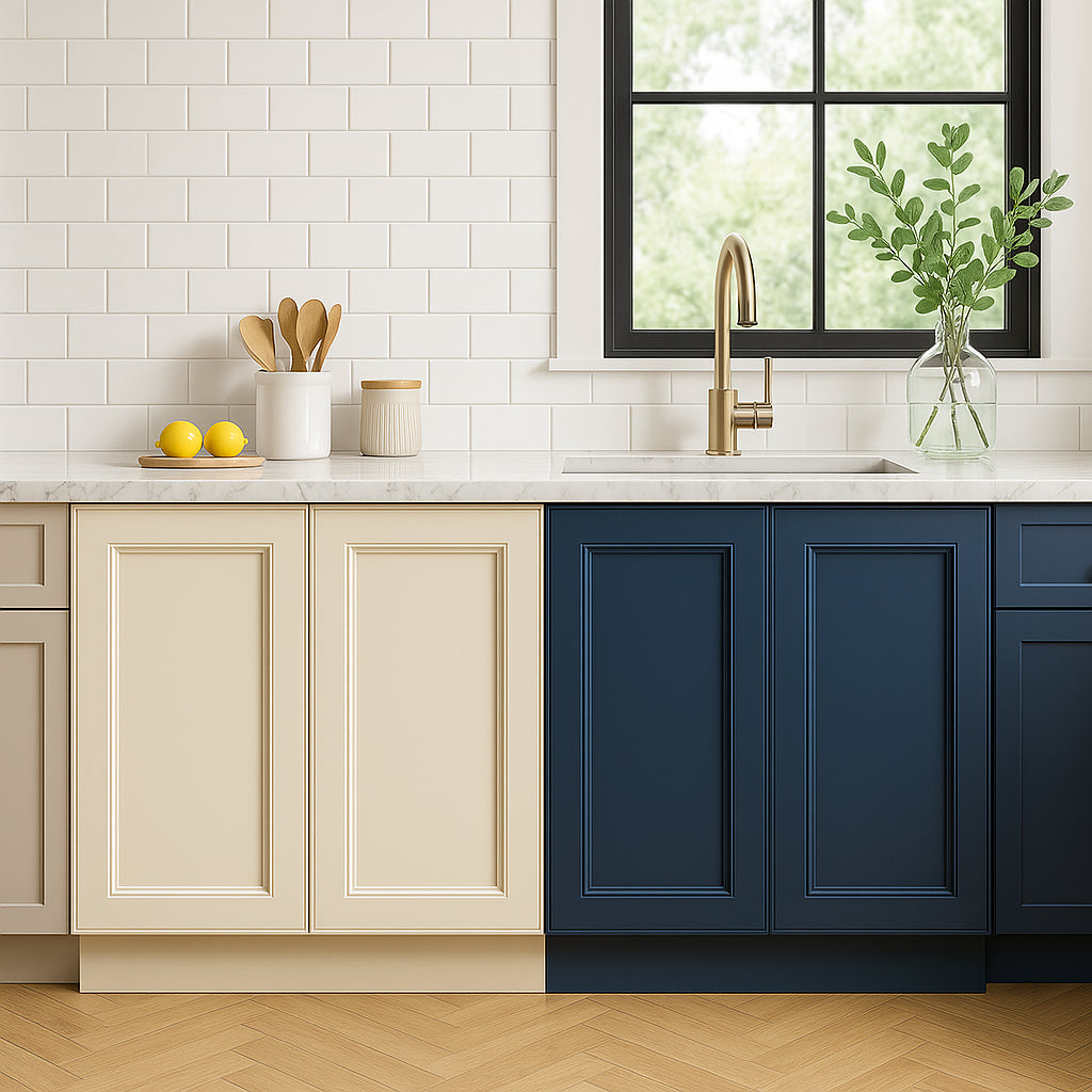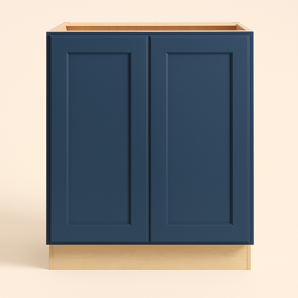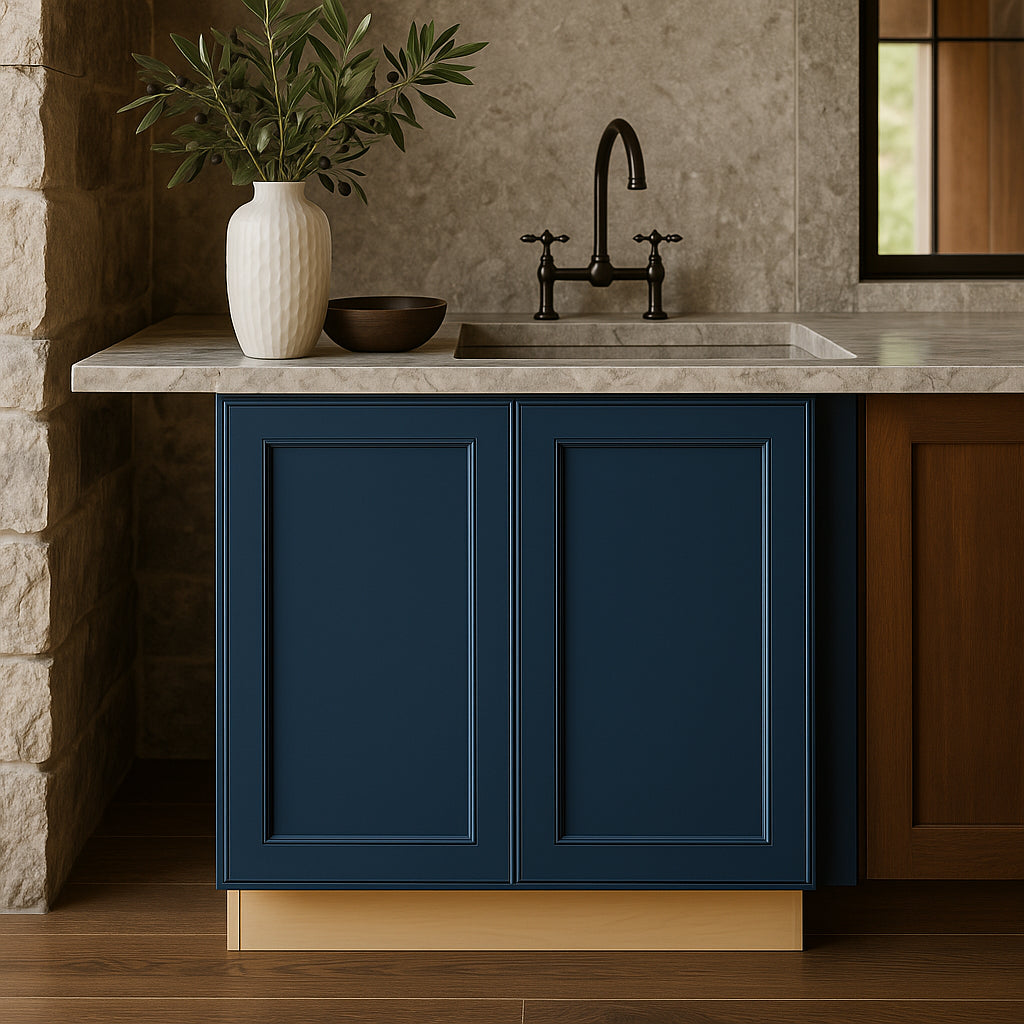 • Elegant Design: Shaker-style doors with recessed panels and a bold mythic blue finish.