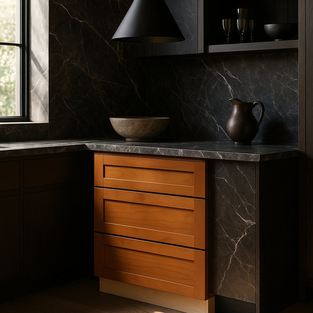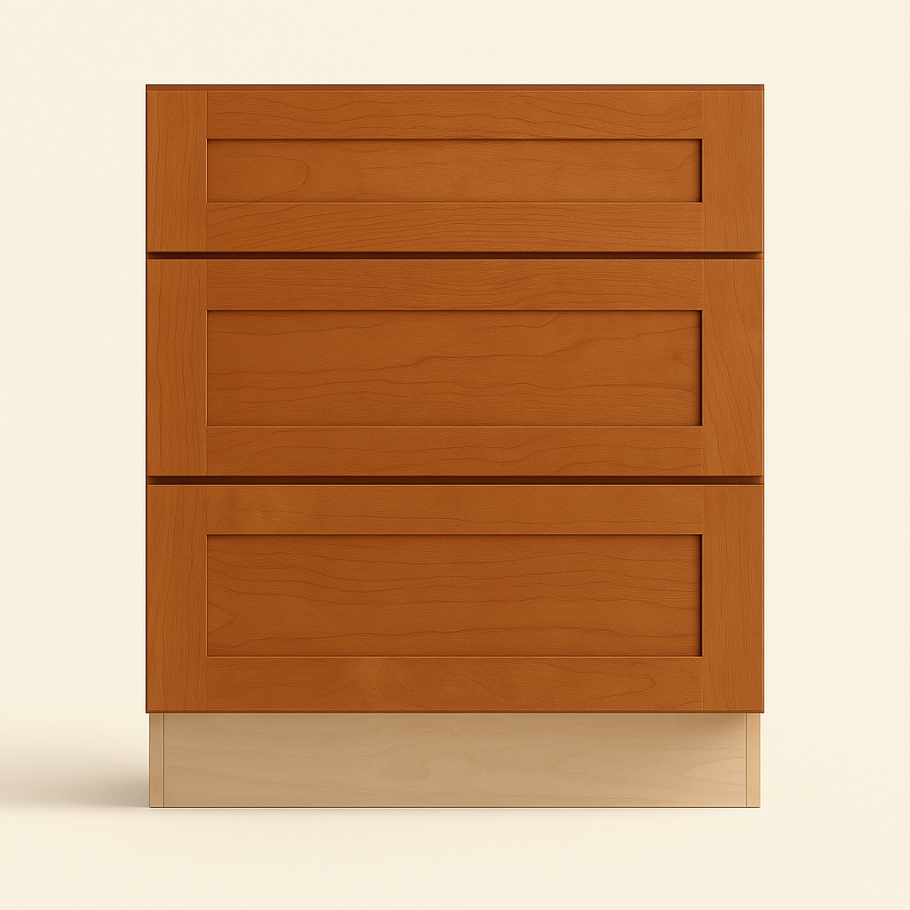 The Newport Cooktop Base Cabinet combines timeless Shaker-inspired design with modern functionality. Crafted from CARB II compliant plywood, it features a warm cinnamon finish, soft-close drawers, and a false top drawer front for cooktop compatibility.