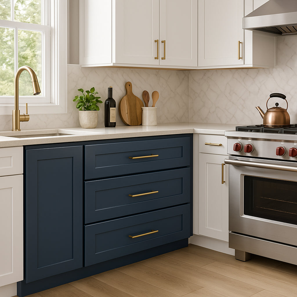 - Elegant Design: Shaker-style MDF doors with a flat recessed center panel and Mythic Blue finish.
