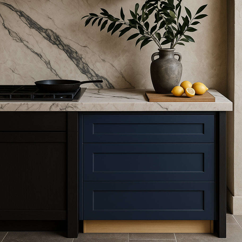 The Newport Cooktop Base Cabinet in Mythic Blue combines professional-grade construction with elegant design. Featuring CARB II compliant all-plywood construction, shaker-style MDF doors, and soft-close dovetail drawers, this cabinet is a sophisticated addition to any kitchen.