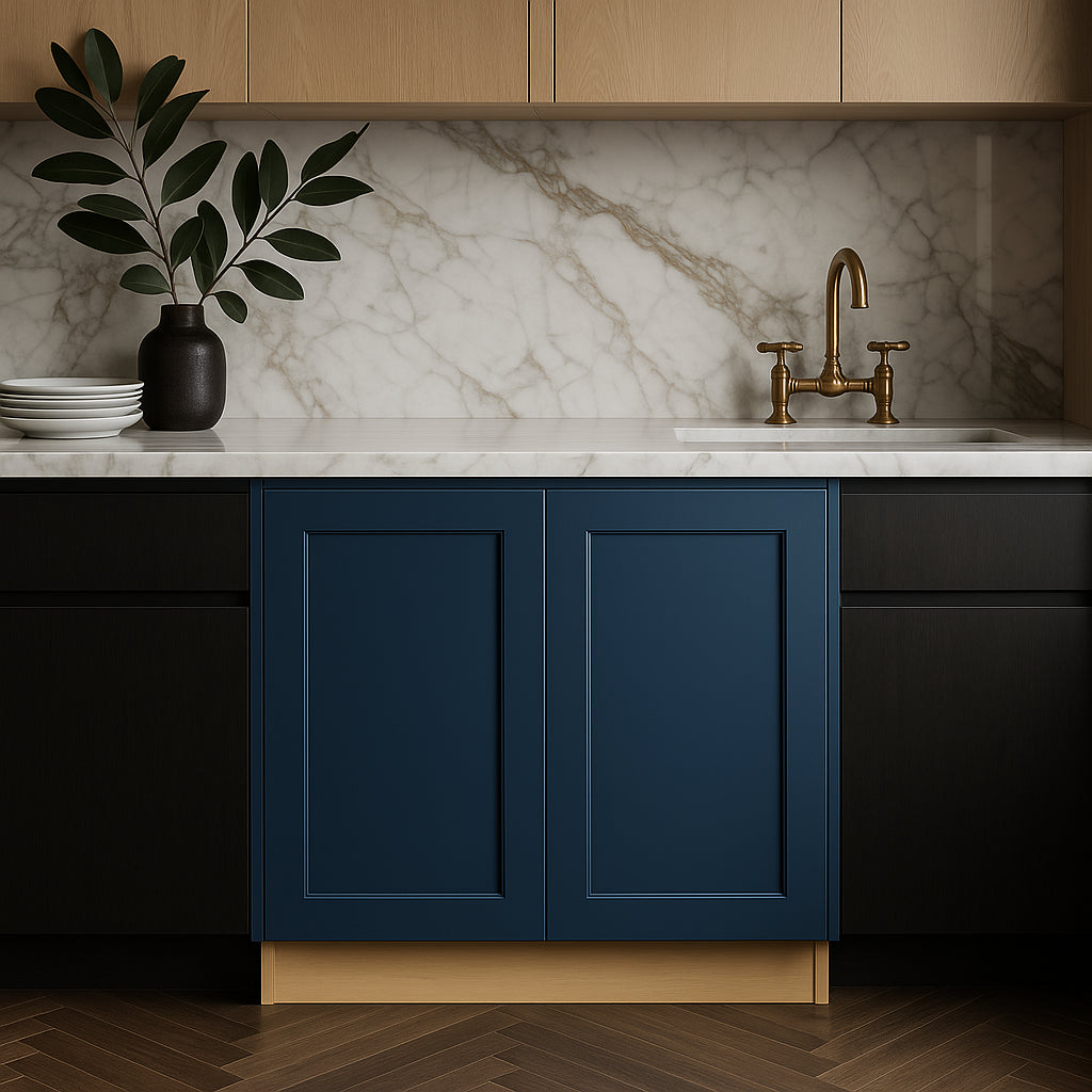 The Mythic Blue Kitchen Base Cabinet is a masterpiece of design and functionality, blending bold color with timeless shaker-style doors to create a striking visual impact. Its durable plywood construction and soft-close doors ensure both longevity and luxury. Pair it with a marble countertop to enhance its sophisticated appeal, making it a centerpiece in any modern kitchen. This cabinet is not just storage; it's a statement of refined taste and practical elegance.