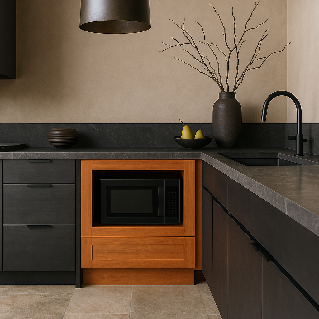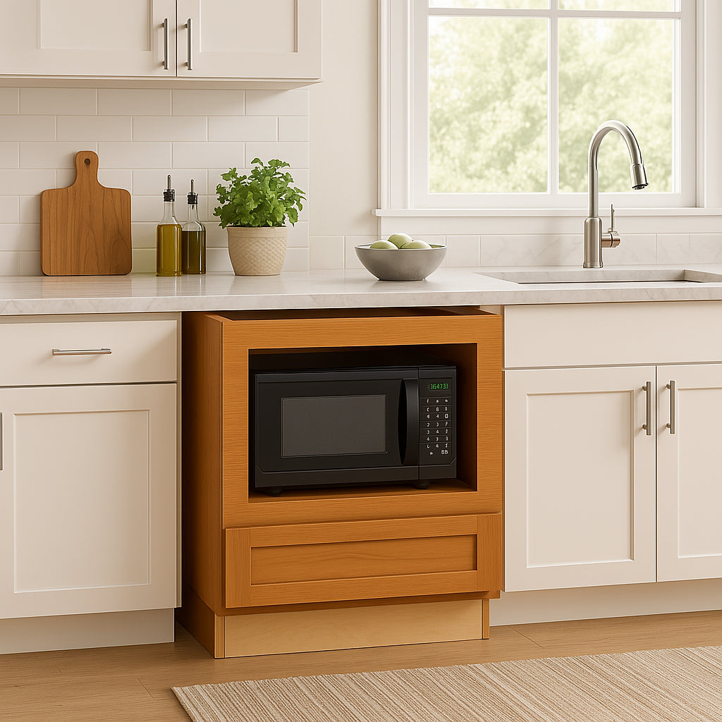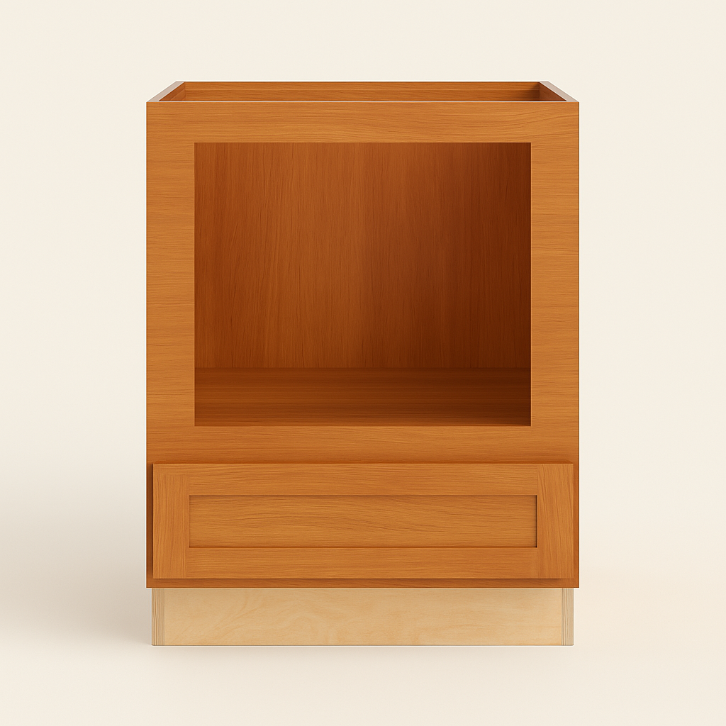 The Newport Cinnamon Microwave Base Cabinet combines shaker-inspired design with modern functionality. Crafted from premium plywood and solid hardwood, it features a rich cinnamon-stained finish and soft-close doors and drawers for a quiet, luxurious kitchen experience.
